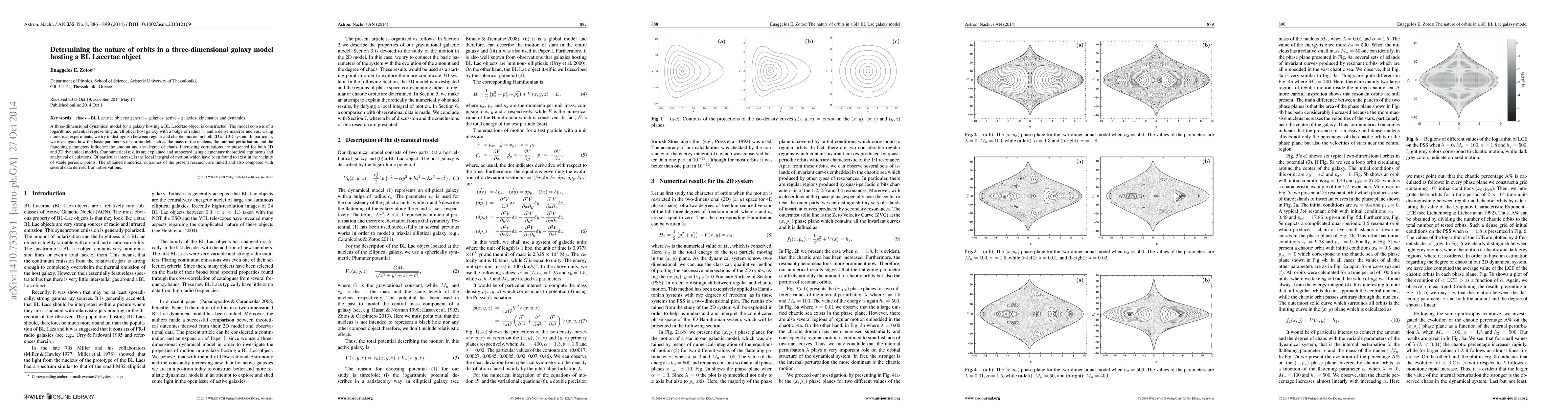 A three-dimensional dynamical model for a galaxy hosting a BL Lacertae object is constructed. The model consists of a logarithmic potential representing an elliptical host galaxy with a bulge of radius $c_b$ and a dense massive nucleus. Using numerical experiments, we try to distinguish between regular and chaotic motion in both 2D and 3D system. In particular, we investigate how the basic parameters of our model, such as the mass of the nucleus, the internal perturbation and the flattening parameters influence the amount and the degree of chaos. Interesting correlations are presented for both 2D and 3D dynamical models. Our numerical results are explained and supported using elementary theoretical arguments and analytical calculations. Of particular interest, is the local integral of motion which have been found to exist in the vicinity of stable periodic points. The obtained numerical outcomes of the present research, are linked and also compared with several data derived from observations.