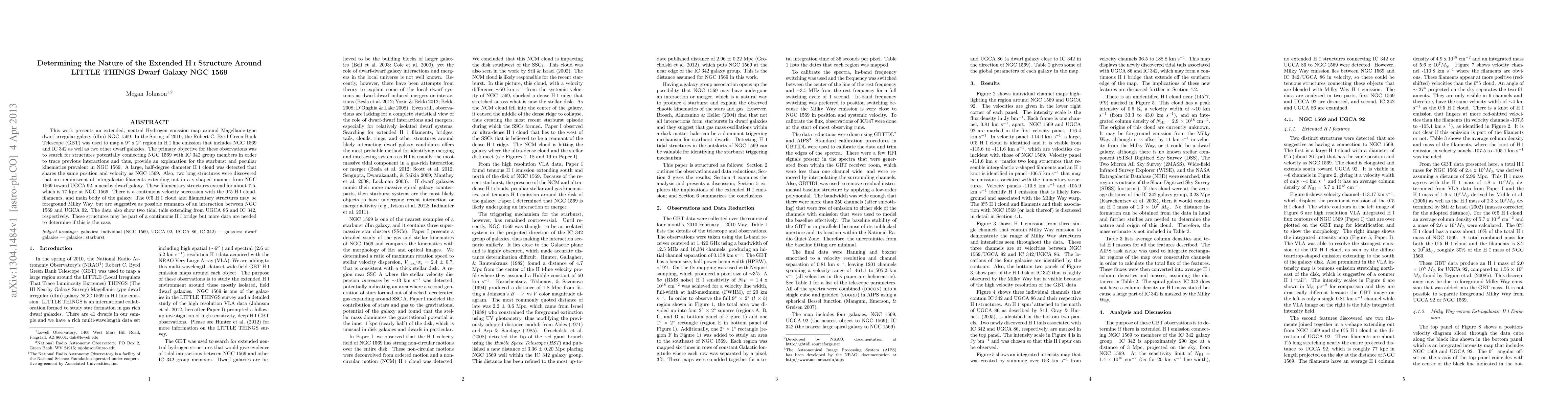This study maps the extended HI structure around the dwarf galaxy NGC 1569 using the GBT, revealing a large HI cloud and filamentary structures extending from NGC 1569, suggesting possible remnants of interactions with nearby galaxies and explaining its starburst activity.