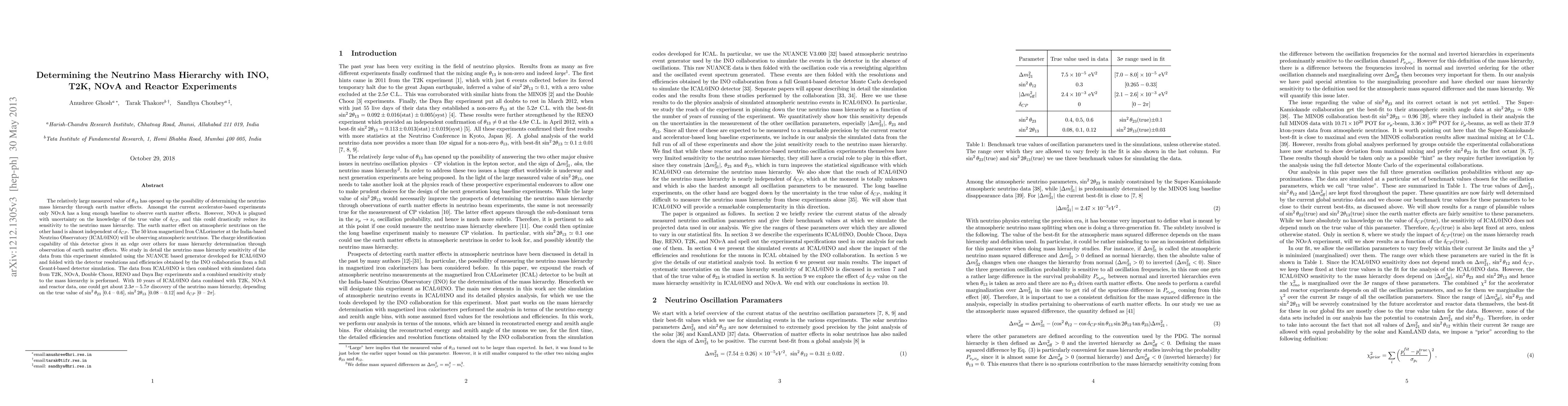 This paper explores the potential of the ICAL@INO detector to determine the neutrino mass hierarchy through earth matter effects, combining its data with results from T2K, NOvA, and reactor experiments. The study projects a $2.3\sigma-5.7\sigma$ discovery of the mass hierarchy over 10 years, contingent on the values of $\sin^2\theta_{23}$, $\sin^22\theta_{13}$, and $\delta_{CP}$.
