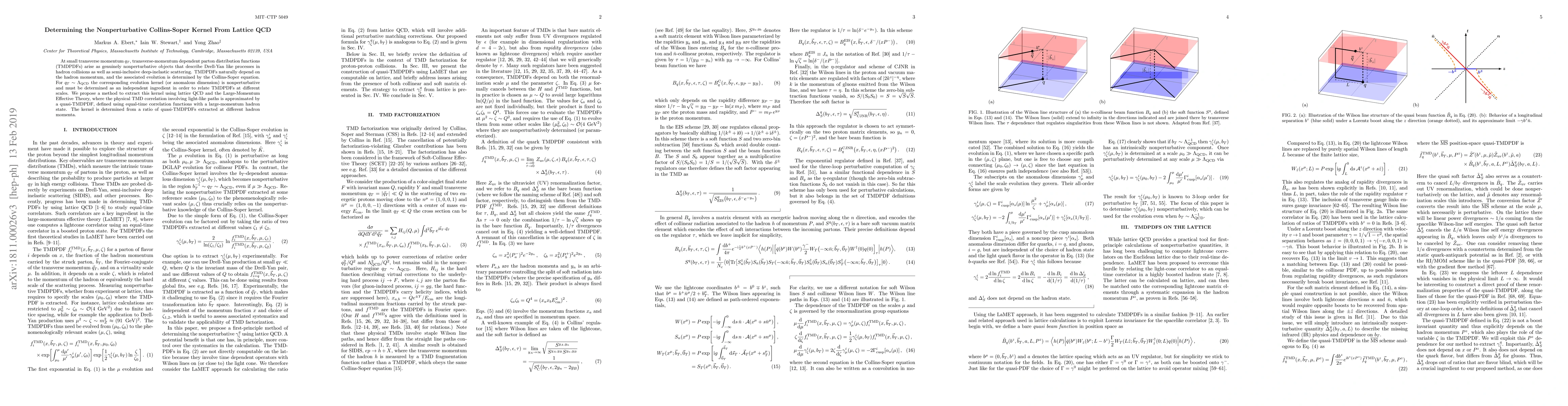 This paper proposes a method to extract the nonperturbative Collins-Soper kernel using lattice QCD and the Large-Momentum Effective Theory, crucial for relating transverse-momentum dependent parton distribution functions at different scales in hadron collisions. The kernel is determined from ratios of quasi TMDPDFs derived from equal-time correlation functions with large-momentum hadron states.