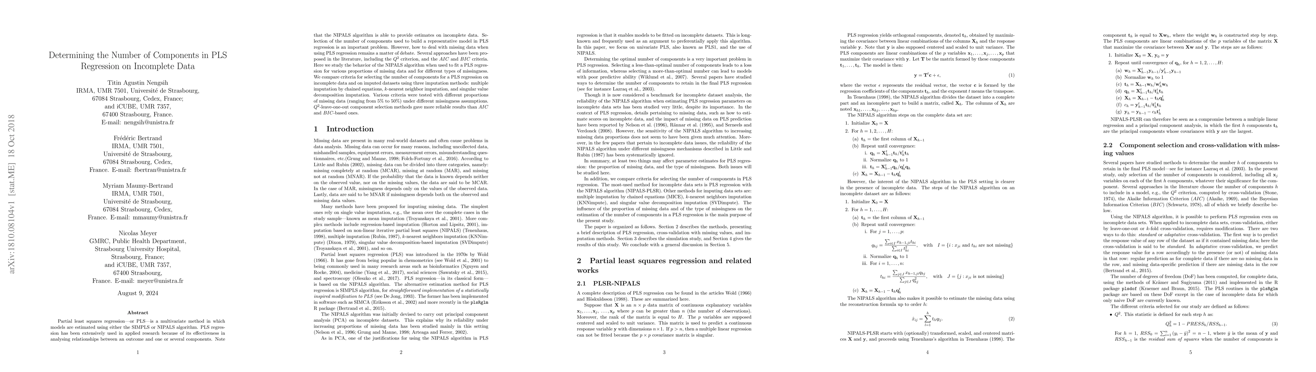 This paper investigates the selection of the number of components in PLS regression when dealing with incomplete data, comparing various criteria like $Q^2$, AIC, and BIC. It evaluates the NIPALS algorithm's performance under different missing data proportions and types, and assesses the impact of imputation methods on component selection.
