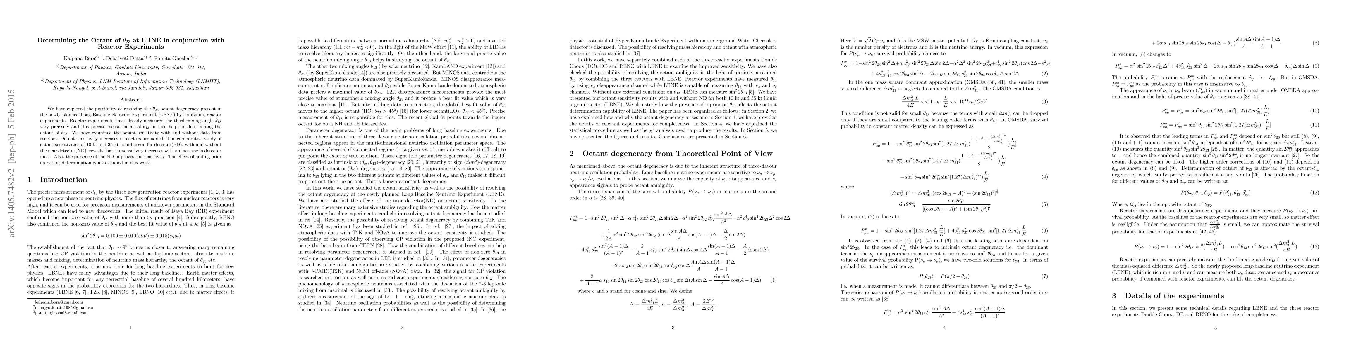 This paper investigates the resolution of the $\theta_{23}$ octant ambiguity in the Long-Baseline Neutrino Experiment (LBNE) by integrating reactor neutrino data, which provides a precise measurement of $\theta_{13}$. The inclusion of reactor data enhances the sensitivity to the $\theta_{23}$ octant, and larger detector masses and the presence of a Near Detector further improve this sensitivity.