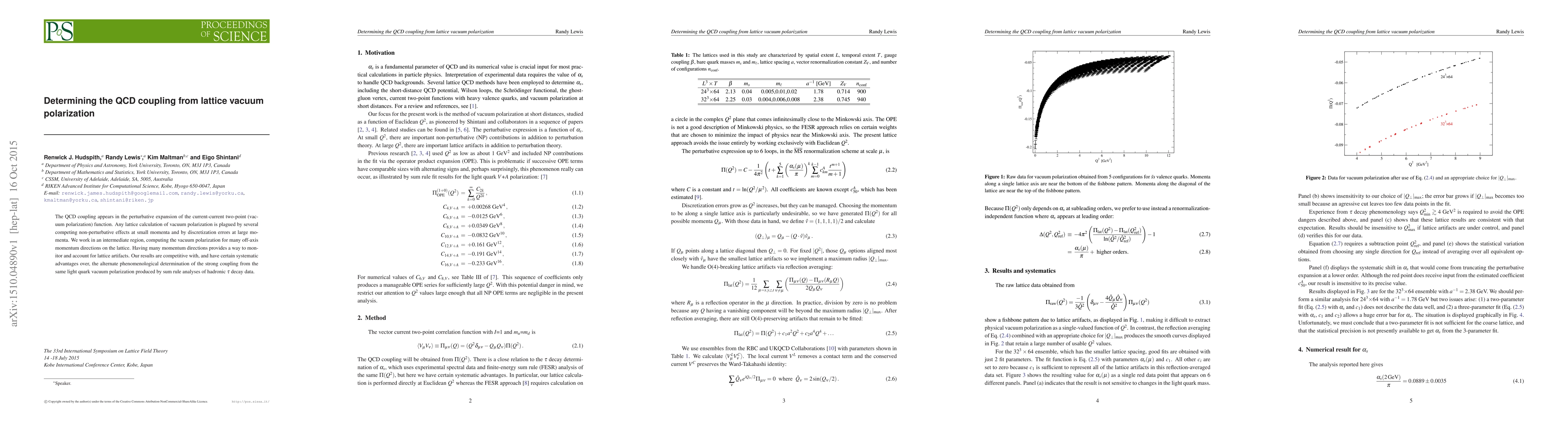The QCD coupling appears in the perturbative expansion of the current-current two-point (vacuum polarization) function. Any lattice calculation of vacuum polarization is plagued by several competing non-perturbative effects at small momenta and by discretization errors at large momenta. We work in an intermediate region, computing the vacuum polarization for many off-axis momentum directions on the lattice. Having many momentum directions provides a way to monitor and account for lattice artifacts. Our results are competitive with, and have certain systematic advantages over, the alternate phenomenological determination of the strong coupling from the same light quark vacuum polarization produced by sum rule analyses of hadronic tau decay data.