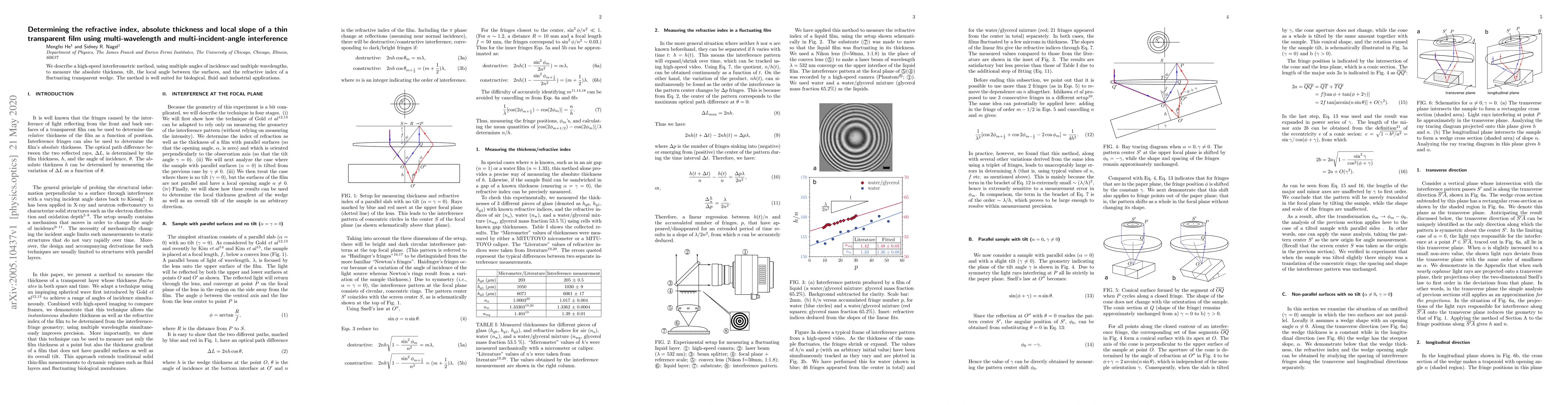 This paper presents a high-speed interferometric method utilizing multiple angles and wavelengths to determine the refractive index, absolute thickness, and local slope of thin transparent films, suitable for various applications in biology, fluid dynamics, and industry. The technique effectively measures fluctuating transparent wedges and their surface angles.