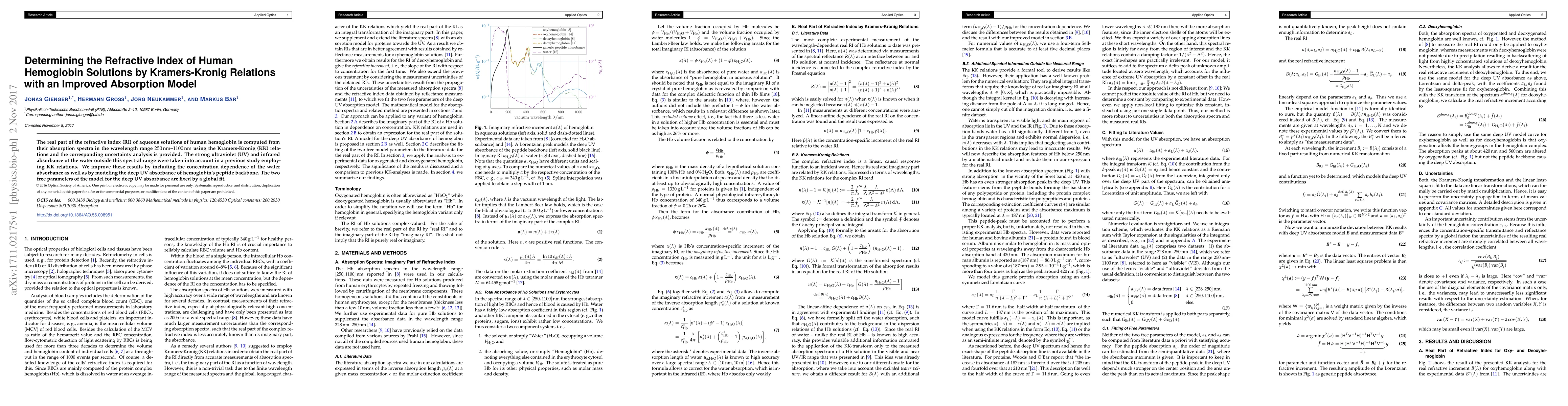 The real part of the refractive index (RI) of aqueous solutions of human hemoglobin is computed from their absorption spectra in the wavelength range $250\,{\rm nm} - 1100\,{\rm nm}$ using the Kramers-Kronig (KK) relations and the corresponding uncertainty analysis is provided. The strong ultraviolet (UV) and infrared absorbance of the water outside this spectral range were taken into account in a previous study employing KK relations. We improve these results by including the concentration dependence of the water absorbance as well as by modeling the deep UV absorbance of hemoglobin's peptide backbone. The two free parameters of the model for the deep UV absorbance are fixed by a global fit.