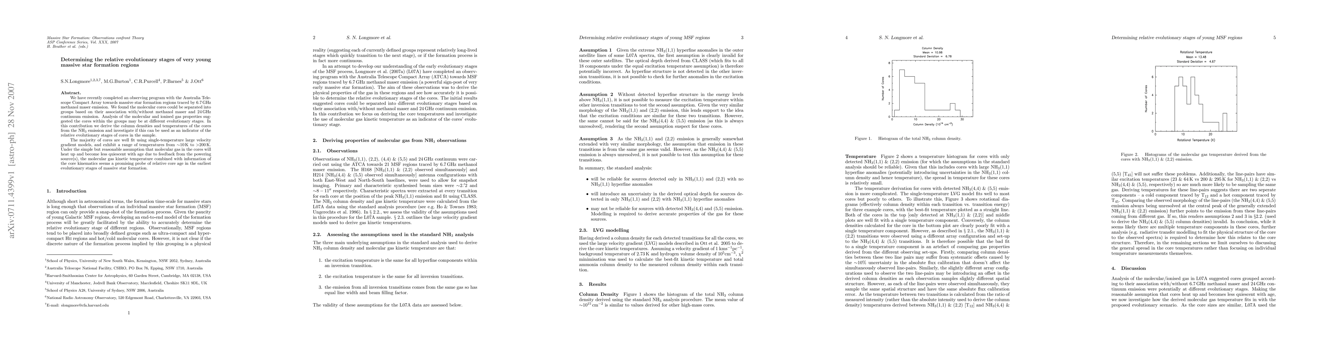 We have recently completed an observing program with the Australia Telescope Compact Array towards massive star formation regions traced by 6.7 GHz methanol maser emission. We found the molecular cores could be separated into groups based on their association with/without methanol maser and 24 GHz continuum emission. Analysis of the molecular and ionised gas properties suggested the cores within the groups may be at different evolutionary stages. In this contribution we derive the column densities and temperatures of the cores from the NH3 emission and investigate if this can be used as an indicator of the relative evolutionary stages of cores in the sample. The majority of cores are well fit using single-temperature large velocity gradient models, and exhibit a range of temperatures from ~10 K to >200 K. Under the simple but reasonable assumption that molecular gas in the cores will heat up and become less quiescent with age due to feedback from the powering source(s), the molecular gas kinetic temperature combined with information of the core kinematics seems a promising probe of relative core age in the earliest evolutionary stages of massive star formation.