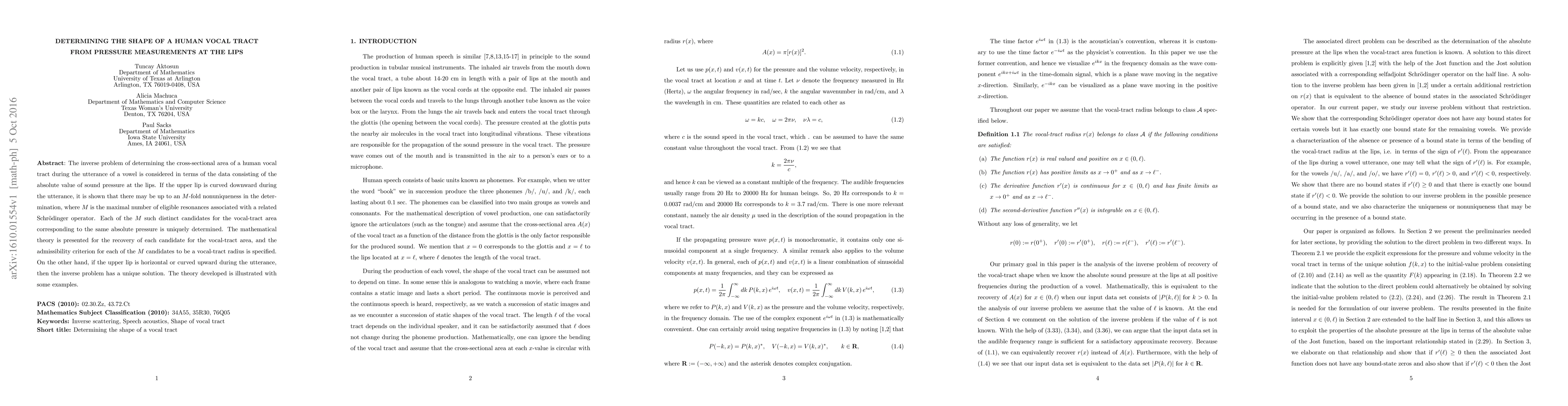 The inverse problem of determining the cross-sectional area of a human vocal tract during the utterance of a vowel is considered in terms of the data consisting of the absolute value of sound pressure at the lips. If the upper lip is curved downward during the utterance, it is shown that there may be up to an $M$-fold nonuniqueness in the determination, where $M$ is the maximal number of eligible resonances associated with a related Schr\"odinger operator. Each of the $M$ such distinct candidates for the vocal-tract area corresponding to the same absolute pressure is uniquely determined. The mathematical theory is presented for the recovery of each candidate for the vocal-tract area, and the admissibility criterion for each of the $M$ candidates to be a vocal-tract radius is specified. On the other hand, if the upper lip is horizontal or curved upward during the utterance, then the inverse problem has a unique solution. The theory developed is illustrated with some examples.