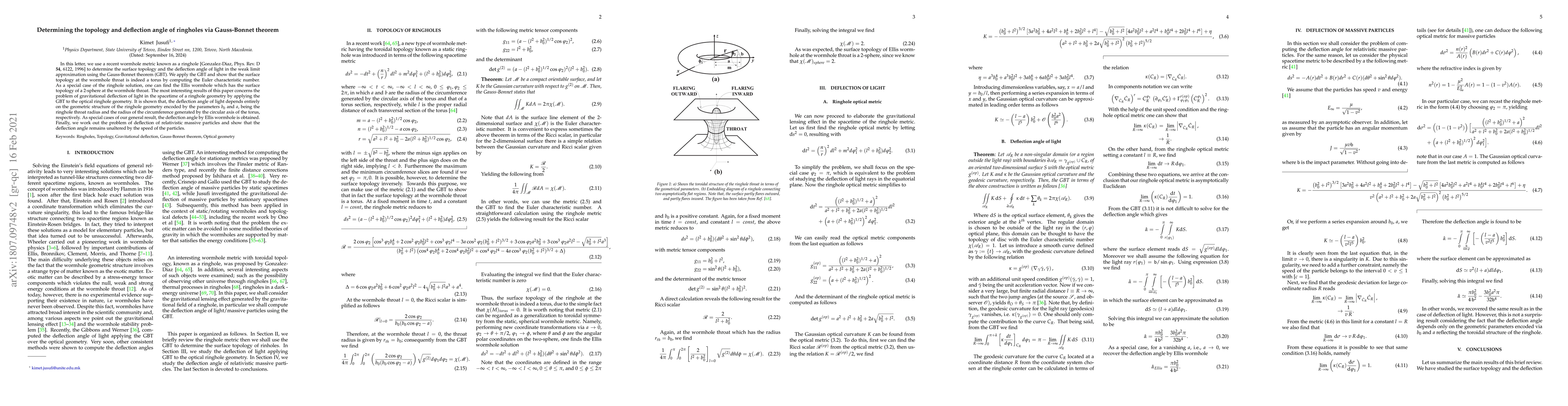 This paper determines the topology of ringhole wormholes as a torus using the Gauss-Bonnet theorem and calculates the deflection angle of light and relativistic particles in the ringhole geometry, showing it depends on the wormhole's geometric parameters. Special cases include the Ellis wormhole and the deflection angle's independence from particle speed.