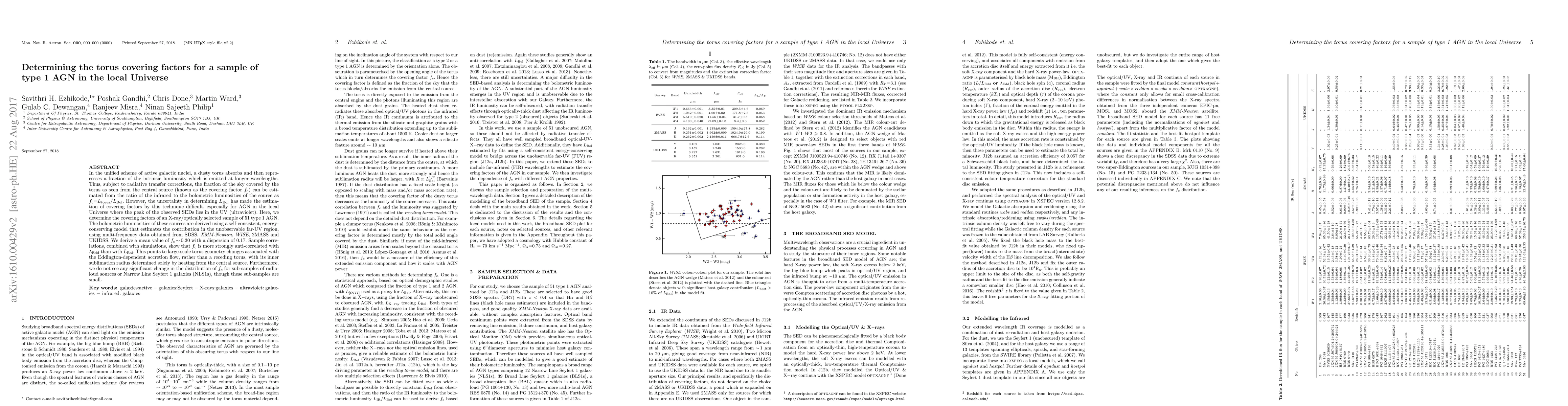 In the unified scheme of active galactic nuclei, a dusty torus absorbs and then reprocesses a fraction of the intrinsic luminosity which is emitted at longer wavelengths. Thus, subject to radiative transfer corrections, the fraction of the sky covered by the torus as seen from the central source (known as the covering factor $f_c$) can be estimated from the ratio of the infrared to the bolometric luminosities of the source as $f_c=L_{\rm torus}/L_{\rm Bol}$. However, the uncertainty in determining $L_{\rm Bol}$ has made the estimation of covering factors by this technique difficult, especially for AGN in the local Universe where the peak of the observed SEDs lies in the UV (ultraviolet). Here, we determine the covering factors of an X-ray/optically selected sample of 51 type~1 AGN. The bolometric luminosities of these sources are derived using a self-consistent, energy-conserving model that estimates the contribution in the unobservable far-UV region, using multi-frequency data obtained from SDSS, \textit{XMM-Newton}, \textit{WISE}, 2MASS and UKIDSS. We derive a mean value of $f_c\sim$0.30 with a dispersion of 0.17. Sample correlations, combined with simulations, show that $f_c$ is more strongly anti-correlated with $\lambda_{\rm Edd}$ than with $L_{\rm Bol}$. This points to large-scale torus geometry changes associated with the Eddington-dependent accretion flow, rather than a receding torus, with its inner sublimation radius determined solely by heating from the central source. Furthermore, we do not see any significant change in the distribution of $f_c$ for sub-samples of radio-loud sources or Narrow Line Seyfert~1 galaxies (NLS1s), though these sub-samples are small.