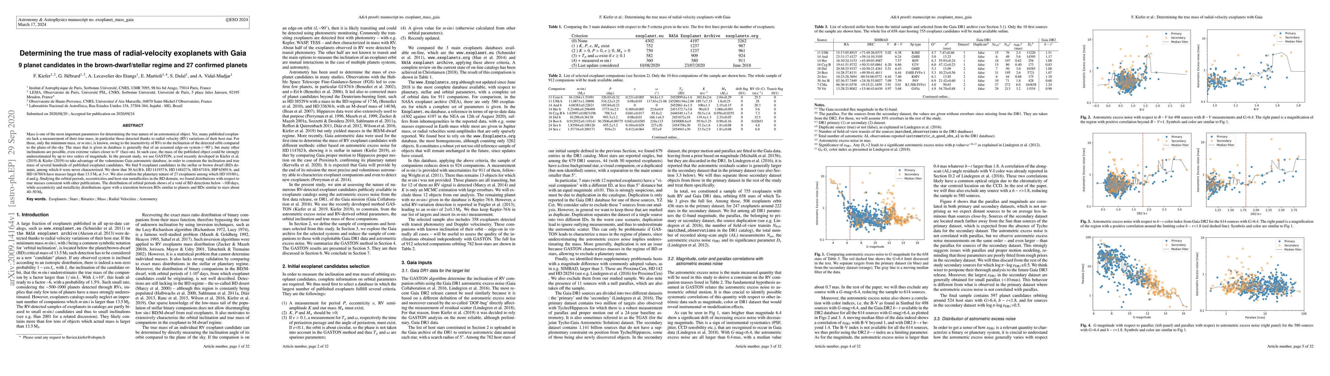 Mass is one of the most important parameters for determining the true nature of an astronomical object. Yet, many published exoplanets lack a measurement of their true mass, in particular those detected thanks to radial velocity (RV) variations of their host star. For those, only the minimum mass, or $m\sin i$, is known, owing to the insensitivity of RVs to the inclination of the detected orbit compared to the plane-of-the-sky. The mass that is given in database is generally that of an assumed edge-on system ($\sim$90$^\circ$), but many other inclinations are possible, even extreme values closer to 0$^\circ$ (face-on). In such case, the mass of the published object could be strongly underestimated by up to two orders of magnitude. In the present study, we use GASTON, a tool recently developed in Kiefer et al. (2019) & Kiefer (2019) to take advantage of the voluminous Gaia astrometric database, in order to constrain the inclination and true mass of several hundreds of published exoplanet candidates. We find 9 exoplanet candidates in the stellar or brown dwarf (BD) domain, among which 6 were never characterized. We show that 30 Ari B b, HD 141937 b, HD 148427 b, HD 6718 b, HIP 65891 b, and HD 16760 b have masses larger than 13.5 M$_\text{J}$ at 3-$\sigma$. We also confirm the planetary nature of 27 exoplanets among which HD 10180 c, d and g. Studying the orbital periods, eccentricities and host-star metallicities in the BD domain, we found distributions with respect to true masses consistent with other publications. The distribution of orbital periods shows of a void of BD detections below $\sim$100 days, while eccentricity and metallicity distributions agree with a transition between BDs similar to planets and BDs similar to stars about 40-50 M$_\text{J}$.
