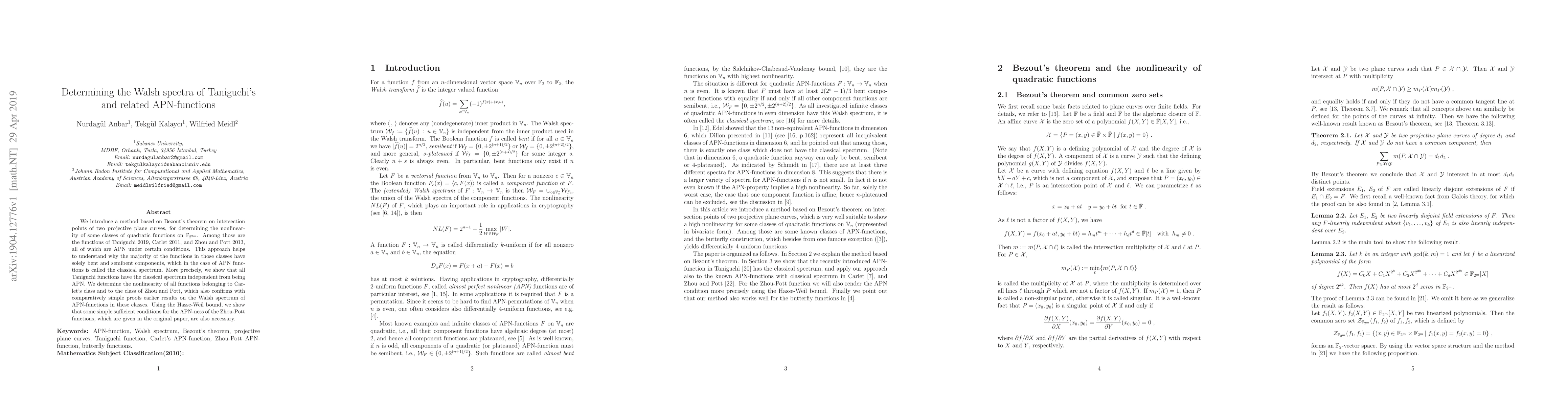 This paper employs Bezout's theorem to determine the nonlinearity and Walsh spectra of specific APN functions, including Taniguchi's, Carlet's, and Zhou-Pott classes. It confirms that Taniguchi functions exhibit the classical spectrum regardless of APN status and validates earlier results on their Walsh spectra with simpler proofs.