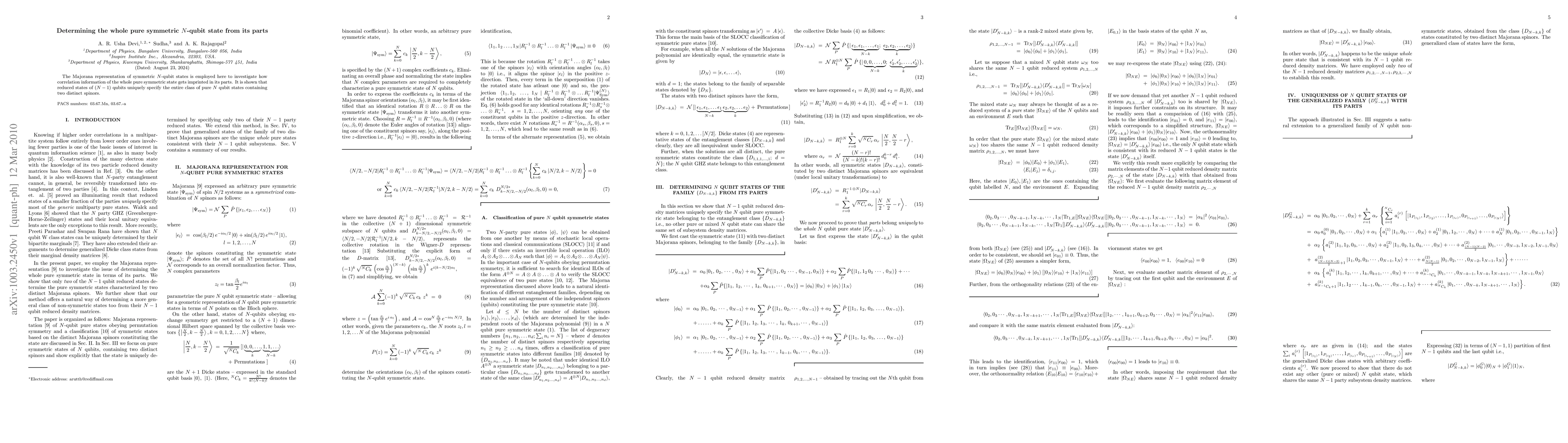 The Majorana representation of symmetric N-qubit states is employed here to investigate how correlation information of the whole pure symmetric state gets imprinted in its parts. It is shown that reduced states of (N - 1) qubits uniquely specify the entire class of pure N qubit states containing two distinct spinors.