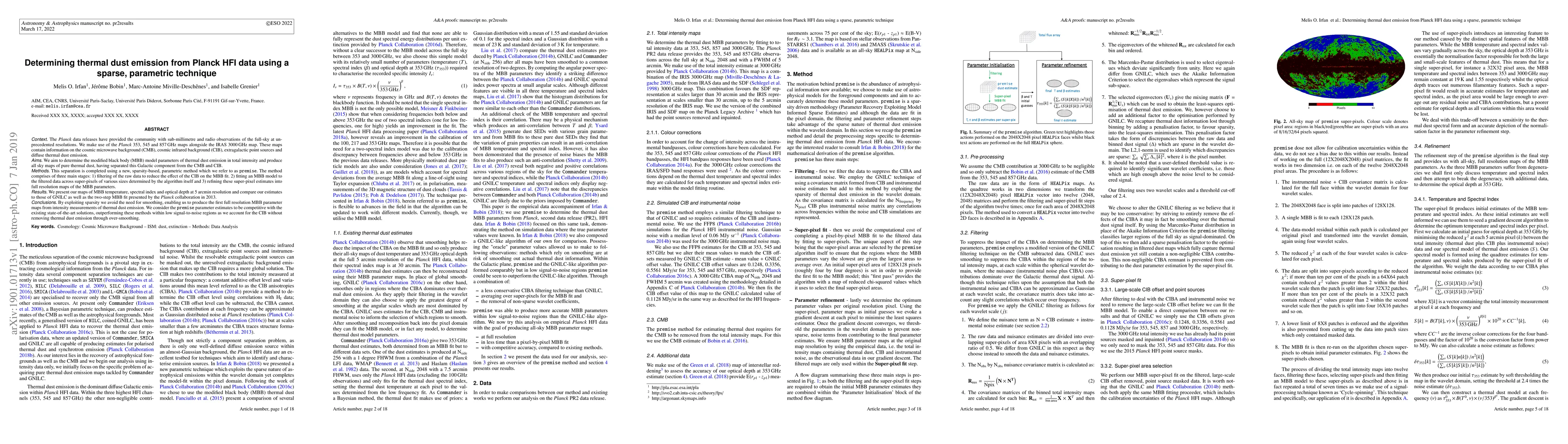 Context: The Planck data releases have provided the community with sub-millimetre and radio observations of the full-sky at unprecedented resolutions. We make use of the Planck 353, 545 and 857 GHz maps alongside the IRAS 3000 GHz map. These maps contain information on the cosmic microwave background (CMB), cosmic infrared background (CIB), extragalactic point sources and diffuse thermal dust emission. Aims: We aim to determine the modified black body (MBB) model parameters of thermal dust emission in total intensity and produce all sky maps of pure thermal dust, having separated this Galactic component from the CMB and CIB. Methods: This separation is completed using a new, sparsity-based, parametric method which we refer to as premise. The method comprises of three main stages: 1) filtering of the raw data to reduce the effect of the CIB on the MBB fit. 2) fitting an MBB model to the filtered data across super-pixels of various sizes determined by the algorithm itself and 3) refining these super-pixel estimates into full resolution maps of the MBB parameters. Results: We present our maps of MBB temperature, spectral index and optical depth at 5 arcmin resolution and compare our estimates to those of GNILC as well as the two-step MBB fit presented by the Planck collaboration in 2013. Conclusions: By exploiting sparsity we avoid the need for smoothing, enabling us to produce the first full resolution MBB parameter maps from intensity measurements of thermal dust emission.We consider the premise parameter estimates to be competitive with the existing state-of-the-art solutions, outperforming these methods within low signal-to-noise regions as we account for the CIB without removing thermal dust emission through over-smoothing.