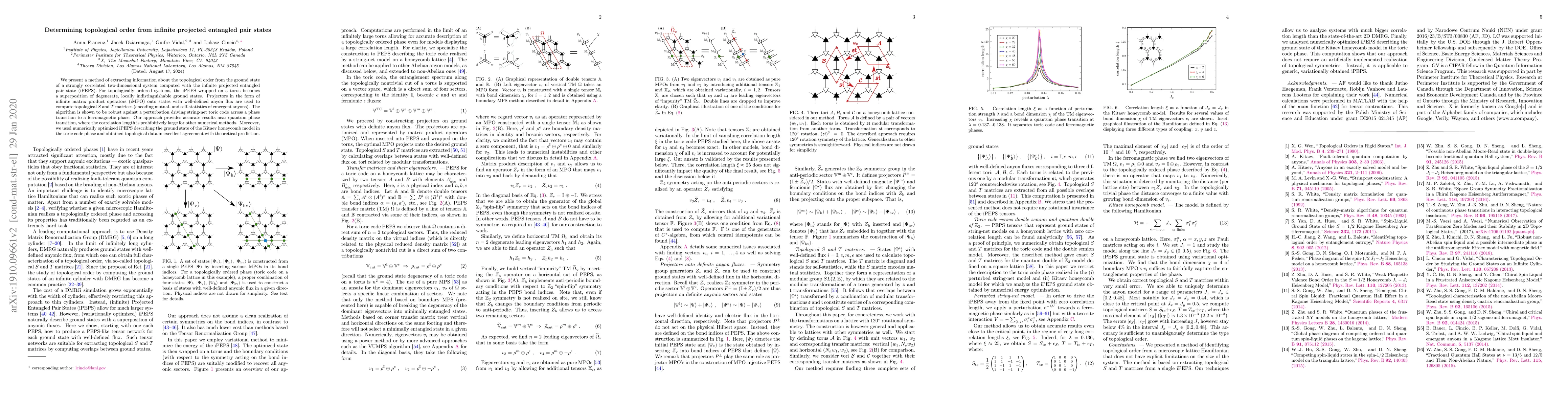 This paper presents a method to extract topological order information from the ground state of strongly correlated two-dimensional systems using infinite projected entangled pair states (iPEPS). The approach employs iMPO projectors to compute topological $S$ and $T$ matrices, demonstrating robustness against phase transitions and yielding accurate results near quantum phase transitions.