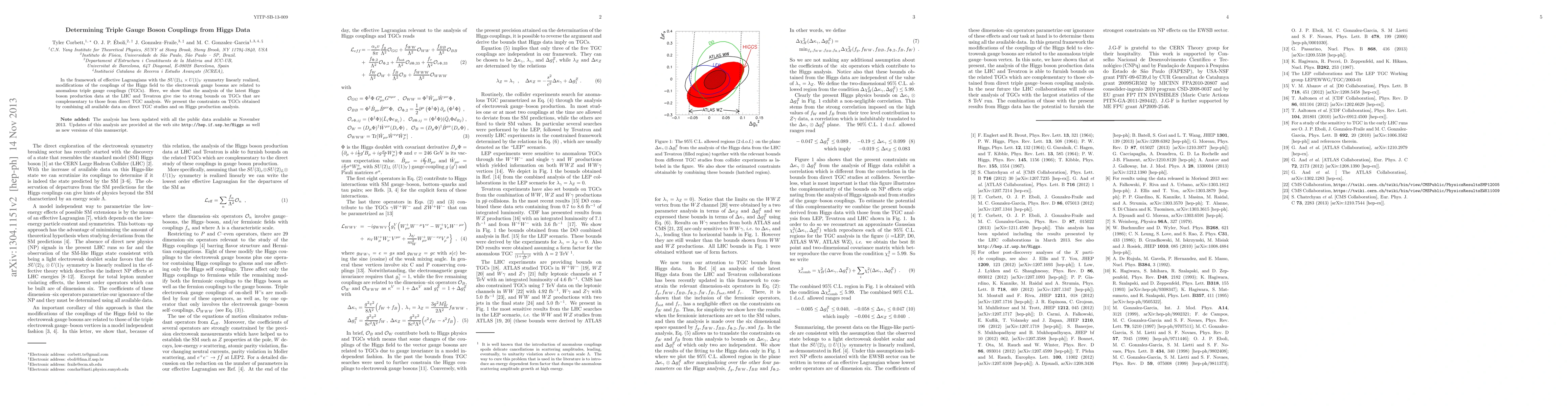 In the framework of effective Lagrangians with the SU(2)_L x U(1)_Y symmetry linearly realized, modifications of the couplings of the Higgs field to the electroweak gauge bosons are related to anomalous triple gauge couplings (TGCs). Here, we show that the analysis of the latest Higgs boson production data at the LHC and Tevatron give rise to strong bounds on TGCs that are complementary to those from direct TGC analysis. We present the constraints on TGCs obtained by combining all available data on direct TGC studies and on Higgs production analysis. Note added: The analysis has been updated with all the public data available as November 2013. Updates of this analysis are provided at http://hep.if.usp.br/Higgs