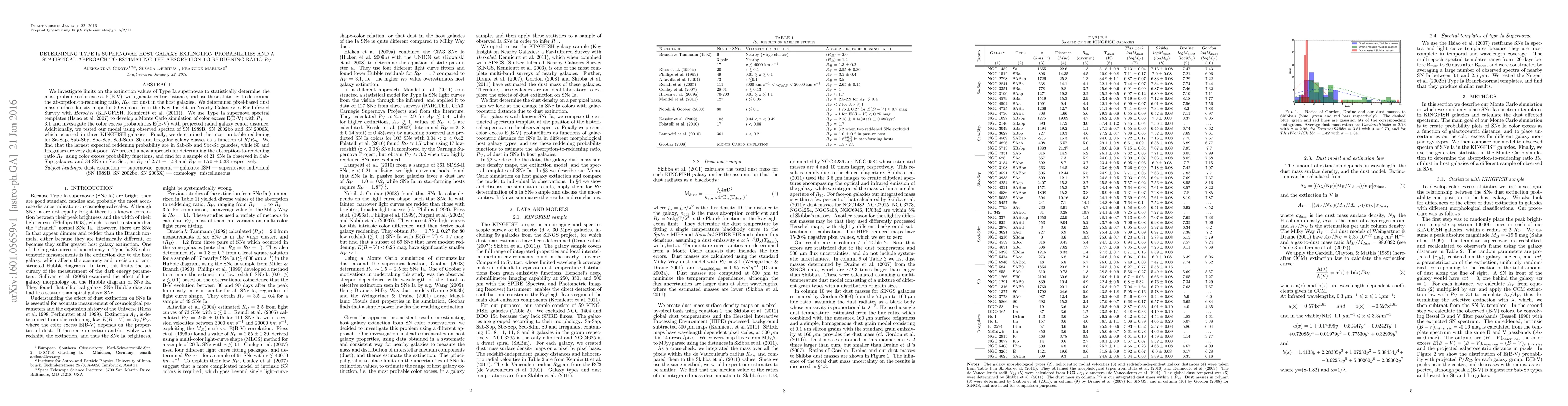 We investigate limits on the extinction values of Type Ia supernovae to statistically determine the most probable color excess, E(B-V), with galactocentric distance, and use these statistics to determine the absorption-to-reddening ratio, $R_V$, for dust in the host galaxies. We determined pixel-based dust mass surface density maps for 59 galaxies from the Key Insight on Nearby Galaxies: a Far-Infrared Survey with \textit{Herschel} (KINGFISH, Kennicutt et al. (2011)). We use Type Ia supernova spectral templates (Hsiao et al. 2007) to develop a Monte Carlo simulation of color excess E(B-V) with $R_V$ = 3.1 and investigate the color excess probabilities E(B-V) with projected radial galaxy center distance. Additionally, we tested our model using observed spectra of SN 1989B, SN 2002bo and SN 2006X, which occurred in three KINGFISH galaxies. Finally, we determined the most probable reddening for Sa-Sap, Sab-Sbp, Sbc-Scp, Scd-Sdm, S0 and Irregular galaxy classes as a function of $R/R_{25}$. We find that the largest expected reddening probability are in Sab-Sb and Sbc-Sc galaxies, while S0 and Irregulars are very dust poor. We present a new approach for determining the absorption-to-reddening ratio $R_V$ using color excess probability functions, and find for a sample of 21 SNe Ia observed in Sab-Sbp galaxies, and 34 SNe in Sbc-Scp, an $R_V$ of 2.71 $\pm$ 1.58 and $R_V$ = 1.70 $\pm$ 0.38 respectively.