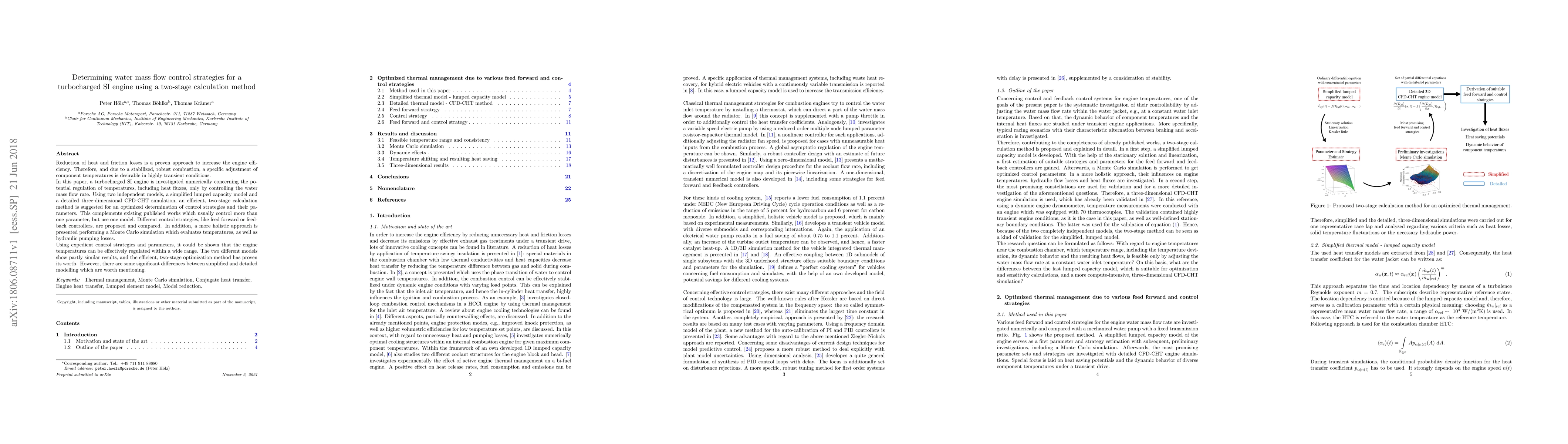 This paper proposes a two-stage calculation method using simplified and detailed models to determine optimal water mass flow control strategies for a turbocharged SI engine to regulate temperatures, reduce losses, and improve efficiency. The study compares different control strategies and highlights the benefits and differences between simplified and detailed modeling approaches.