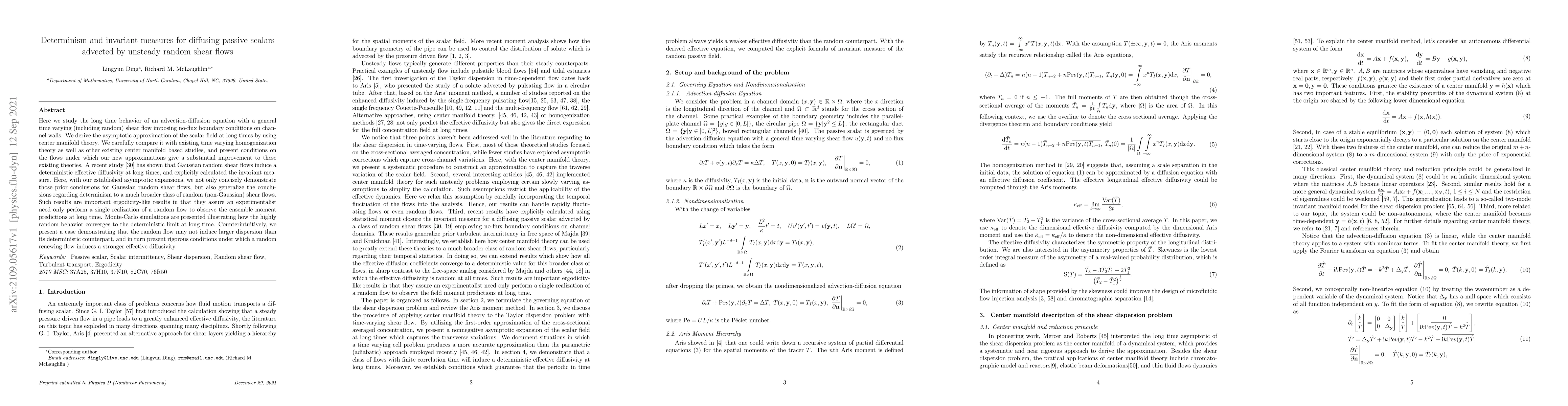 The study employs center manifold theory to analyze the long-time behavior of an advection-diffusion equation with a general time-varying (including random) shear flow under no-flux boundary conditions on channel walls.