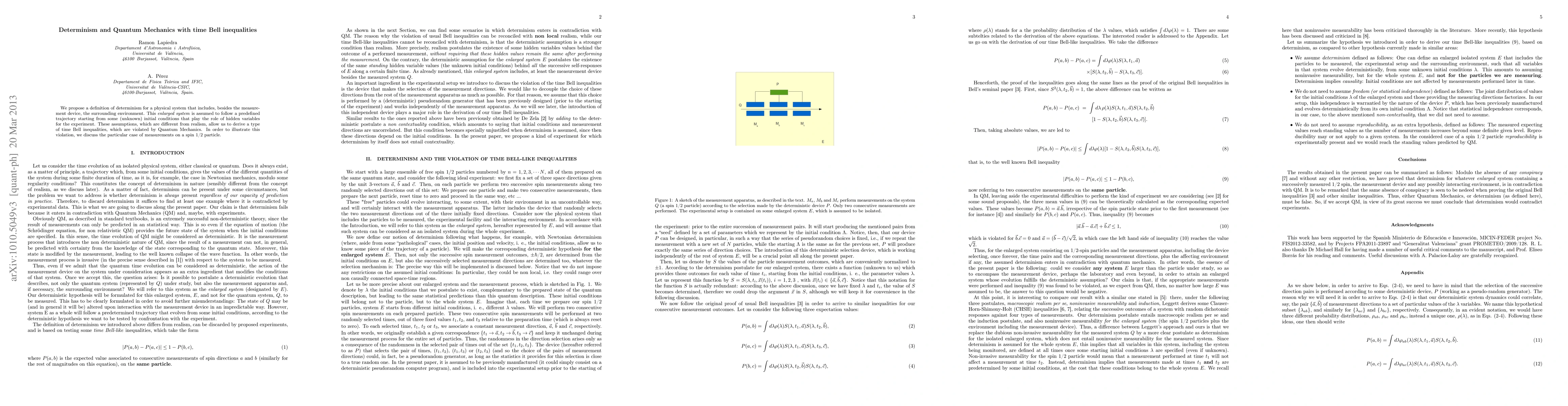 We propose a definition of determinism for a physical system that includes, besides the measurement device, the surrounding environment. This enlarged system is assumed to follow a predefined trajectory starting from some (unknown) initial conditions that play the role of hidden variables for the experiment. These assumptions, which are different from realism, allow us to derive a type of time Bell inequalities, which are violated by Quantum Mechanics. In order to illustrate this violation, we discuss the particular case of measurements on a spin 1/2 particle.