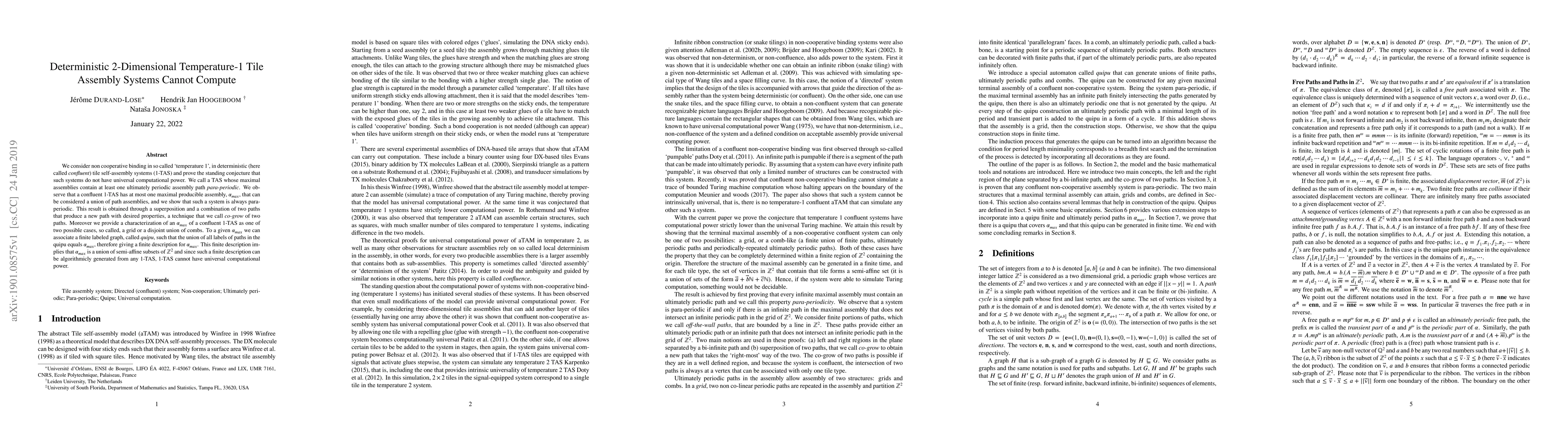 We consider non cooperative binding in so called `temperature 1', in deterministic (here called {\it confluent}) tile self-assembly systems (1-TAS) and prove the standing conjecture that such systems do not have universal computational power. We call a TAS whose maximal assemblies contain at least one ultimately periodic assembly path {\it para-periodic}. We observe that a confluent 1-TAS has at most one maximal producible assembly, $\alpha_{max}$, that can be considered a union of path assemblies, and we show that such a system is always para-periodic. This result is obtained through a superposition and a combination of two paths that produce a new path with desired properties, a technique that we call \emph{co-grow} of two paths. Moreover we provide a characterization of an $\alpha_{max}$ of a confluent 1-TAS as one of two possible cases, so called, a grid or a disjoint union of combs. To a given $\alpha_{max}$ we can associate a finite labeled graph, called \emph{quipu}, such that the union of all labels of paths in the quipu equals $\alpha_{max}$, therefore giving a finite description for $\alpha_{max}$. This finite description implies that $\alpha_{max}$ is a union of semi-affine subsets of $\mathbb{Z}^2$ and since such a finite description can be algorithmicly generated from any 1-TAS, 1-TAS cannot have universal computational power.