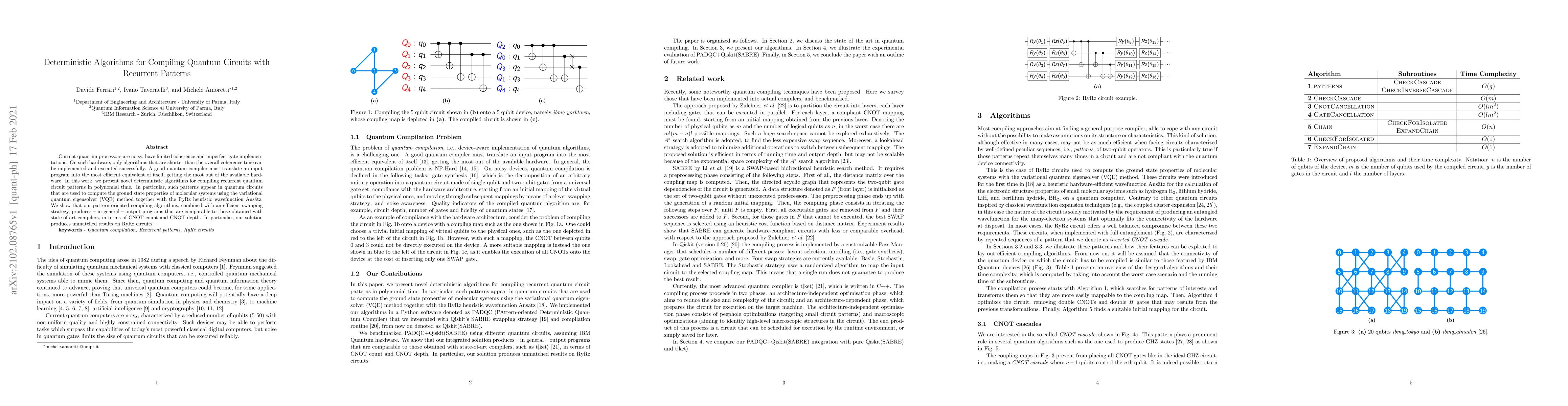 This paper introduces deterministic algorithms for efficiently compiling recurrent quantum circuits, particularly those used in the variational quantum eigensolver (VQE) method for computing molecular ground states. The proposed algorithms achieve comparable results to state-of-the-art compilers in terms of CNOT count and depth, with superior performance on RyRz circuits.