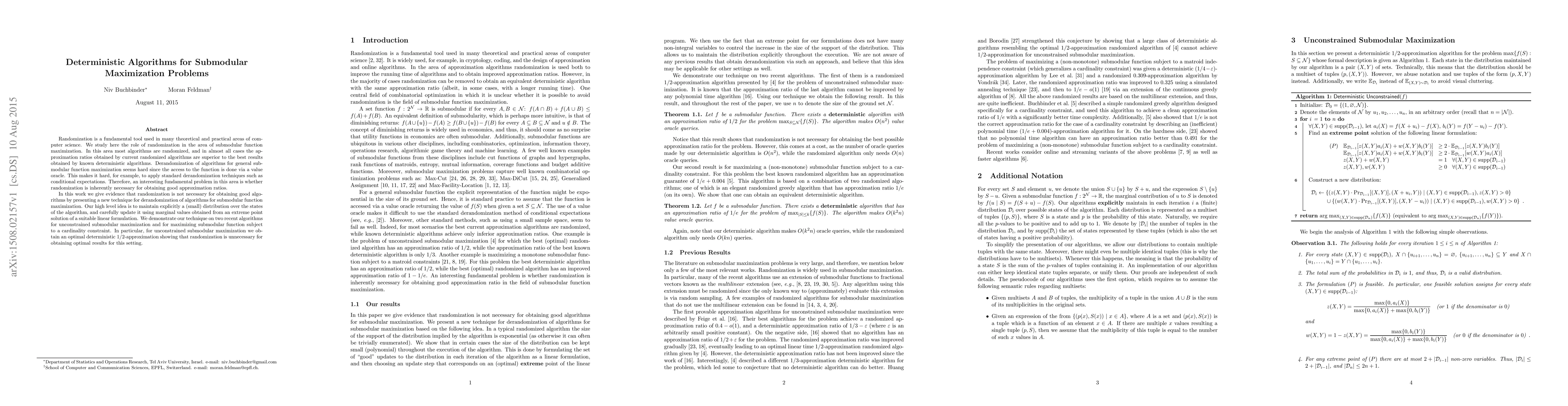 This paper presents a new deterministic algorithm for submodular function maximization, demonstrating that randomization is not essential for achieving good approximation ratios. The authors propose a technique to maintain and update a distribution over algorithm states, achieving optimal $1/2$-approximation for unconstrained submodular maximization.
