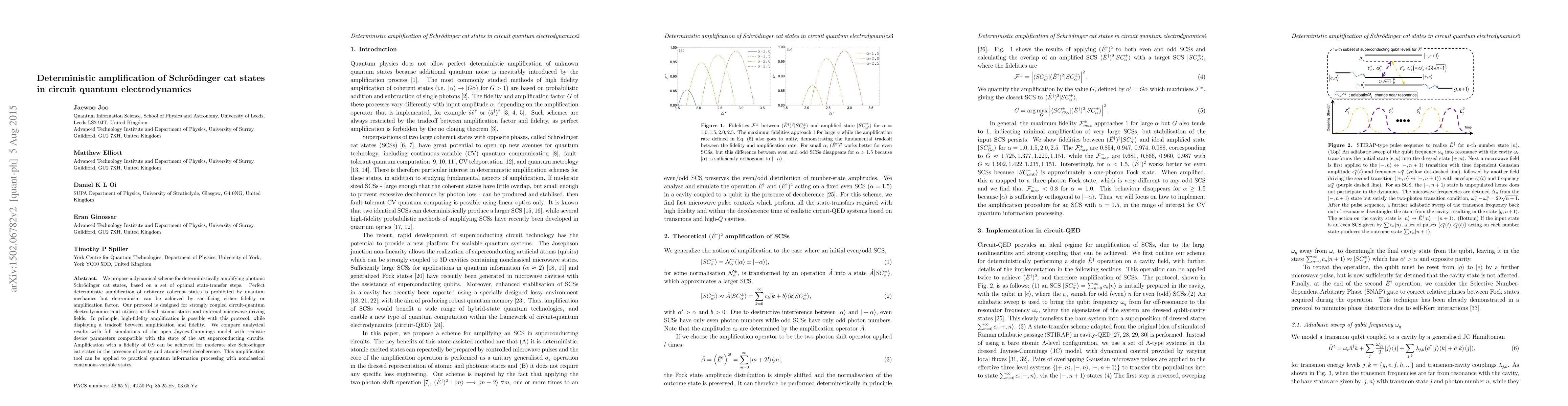 We propose a dynamical scheme for deterministically amplifying photonic Schroedinger cat states based on a set of optimal state-transfers. The scheme can be implemented in strongly coupled qubit-cavity systems and is well suited to the capabilities of state of the art superconducting circuits. The ideal analytical scheme is compared with a full simulation of the open Jaynes-Cummings model with realistic device parameters. This amplification tool can be utilized for practical quantum information processing in non-classical continuous-variable states.