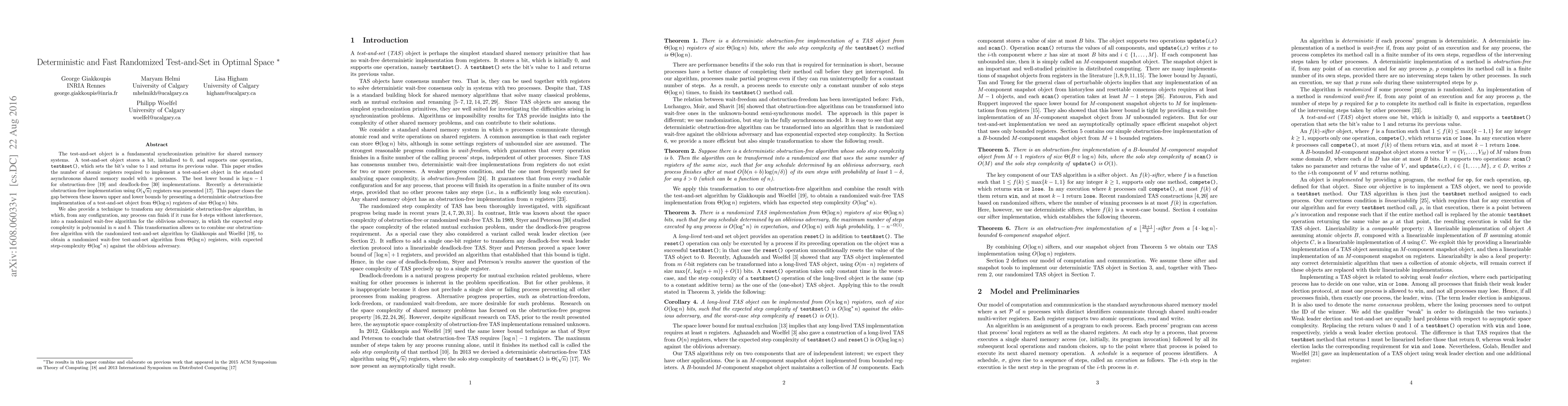 Researchers have developed a deterministic test-and-set algorithm using Theta(log n) registers, improving upon existing bounds of log(n)-1 and O(sqrt(n)) registers. The breakthrough enables wait-free testing in shared memory systems with expected step complexity of Theta(log* n)
