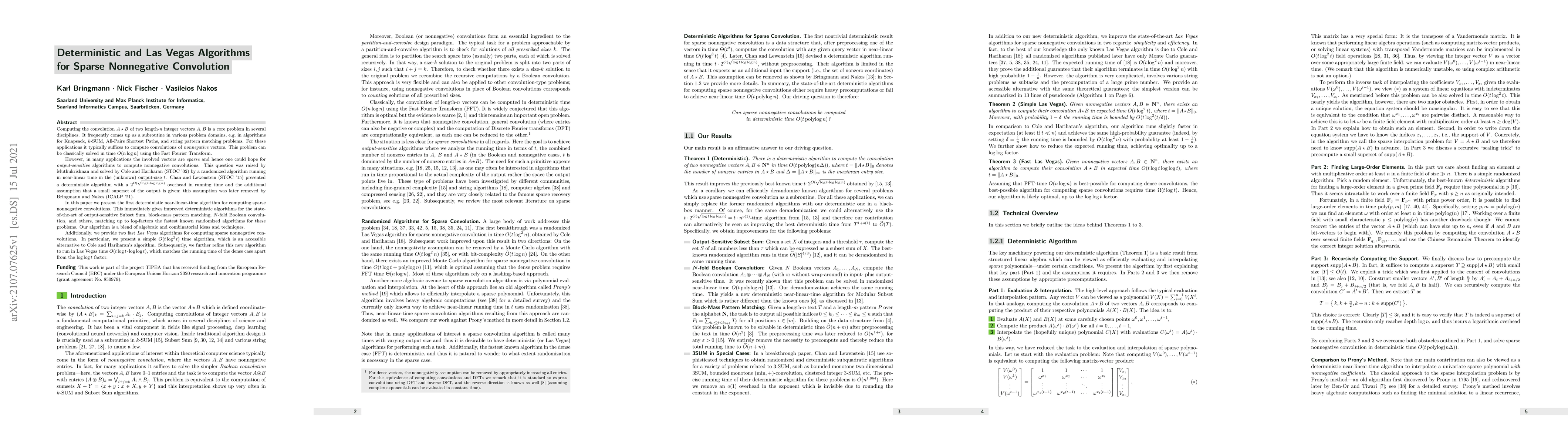 This paper presents a deterministic near-linear-time algorithm for sparse nonnegative convolutions, improving the state-of-the-art for problems like Subset Sum and pattern matching. It also introduces two fast Las Vegas algorithms, one running in $O(t\log^2t)$ time and another refined to $O(t\log t\cdot\log\log t)$ Las Vegas time.