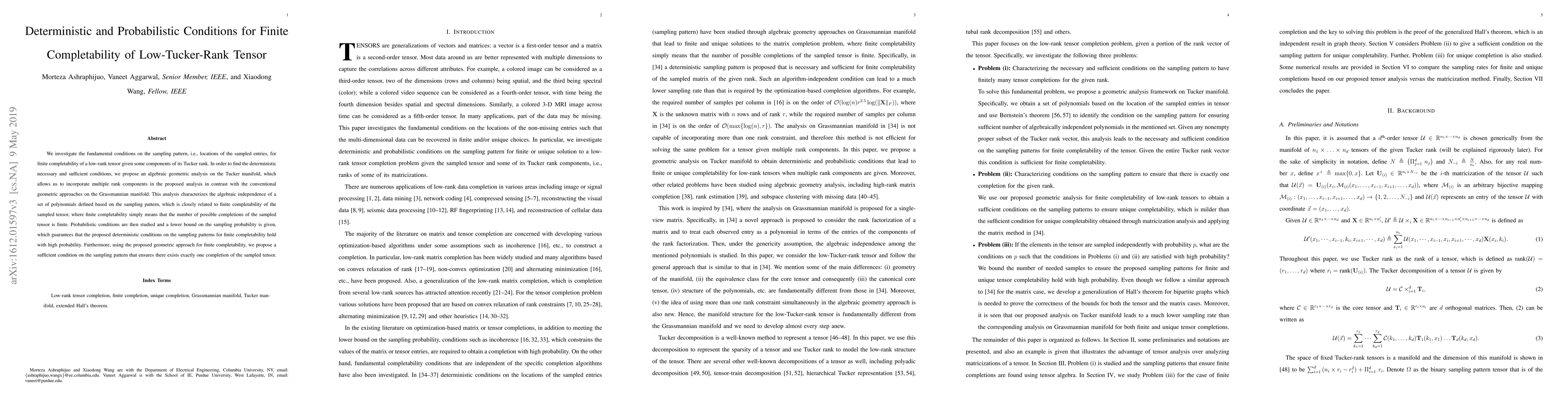This paper explores the necessary and sufficient conditions for the finite completability of low-Tucker-rank tensors based on their sampling patterns. It introduces an algebraic geometric analysis on the Tucker manifold to determine these conditions, providing probabilistic guarantees for high-probability compliance with deterministic rules.
