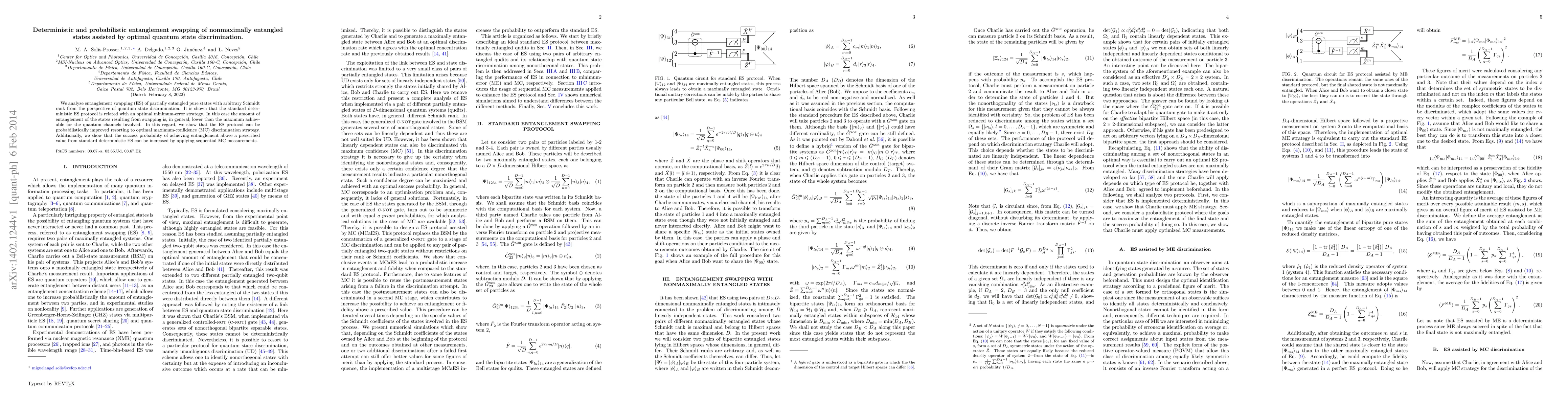 We analyze entanglement swapping (ES) of partially entangled pure states with arbitrary Schmidt rank from the perspective of quantum state discrimination. It is shown that the standard deterministic ES protocol is related with an optimal minimum-error strategy. In this case the amount of entanglement of the states resulting from swapping is, in general, lower than the maximum achievable for the quantum channels involved. In this regard, we show that the ES protocol can be probabilistically improved resorting to optimal maximum-confidence (MC) discrimination strategy. Additionally, we show that the success probability of achieving entanglement above a prescribed value from standard deterministic ES can be increased by applying sequential MC measurements.