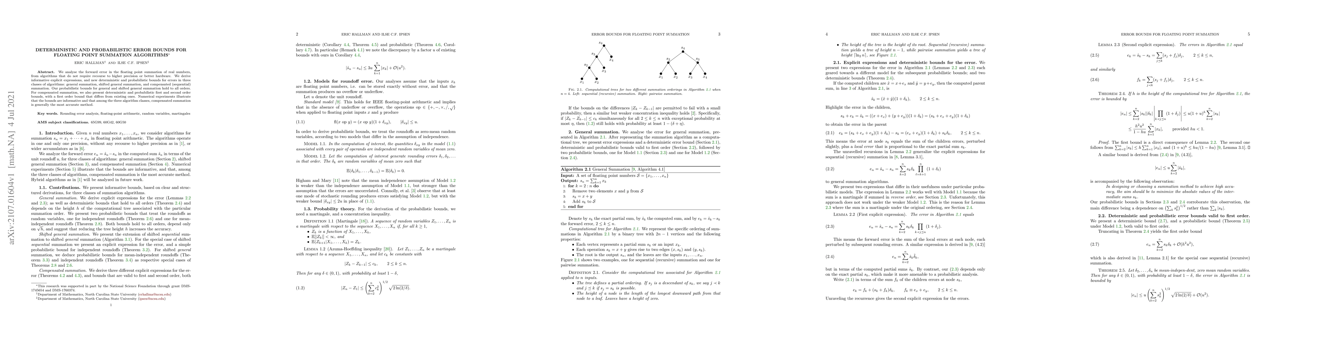 We analyse the forward error in the floating point summation of real numbers, from algorithms that do not require recourse to higher precision or better hardware. We derive informative explicit expressions, and new deterministic and probabilistic bounds for errors in three classes of algorithms: general summation,shifted general summation, and compensated (sequential) summation. Our probabilistic bounds for general and shifted general summation hold to all orders. For compensated summation, we also present deterministic and probabilistic first and second order bounds, with a first order bound that differs from existing ones. Numerical experiments illustrate that the bounds are informative and that among the three algorithm classes, compensated summation is generally the most accurate method.