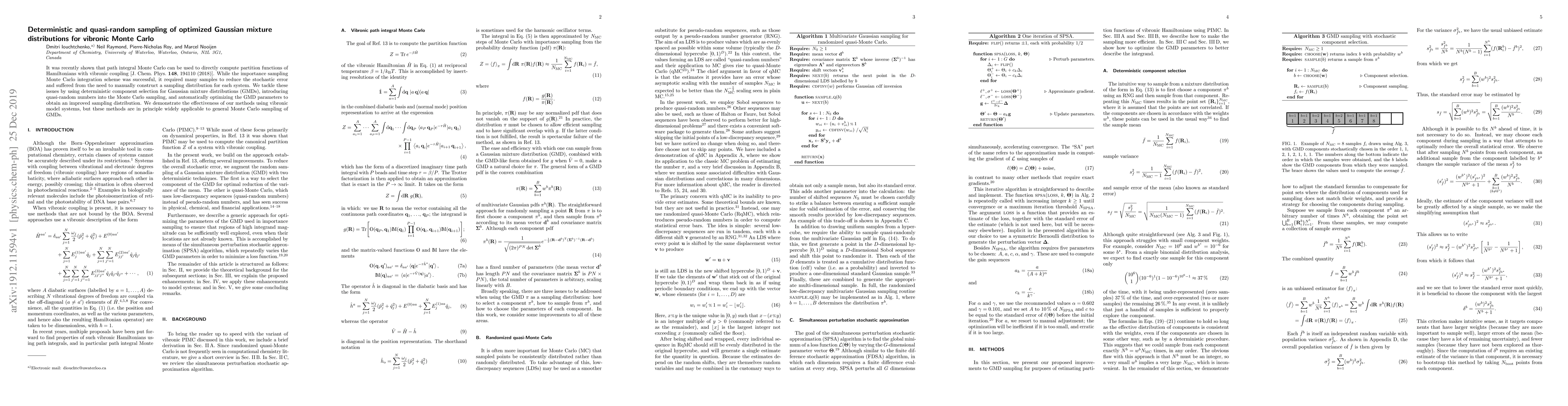 This paper proposes a method combining deterministic and quasi-random sampling to optimize Gaussian mixture distributions for Monte Carlo simulations of vibronic systems. The approach aims to reduce stochastic error and eliminate the need for manually constructing sampling distributions, demonstrating improved performance on vibronic model systems.