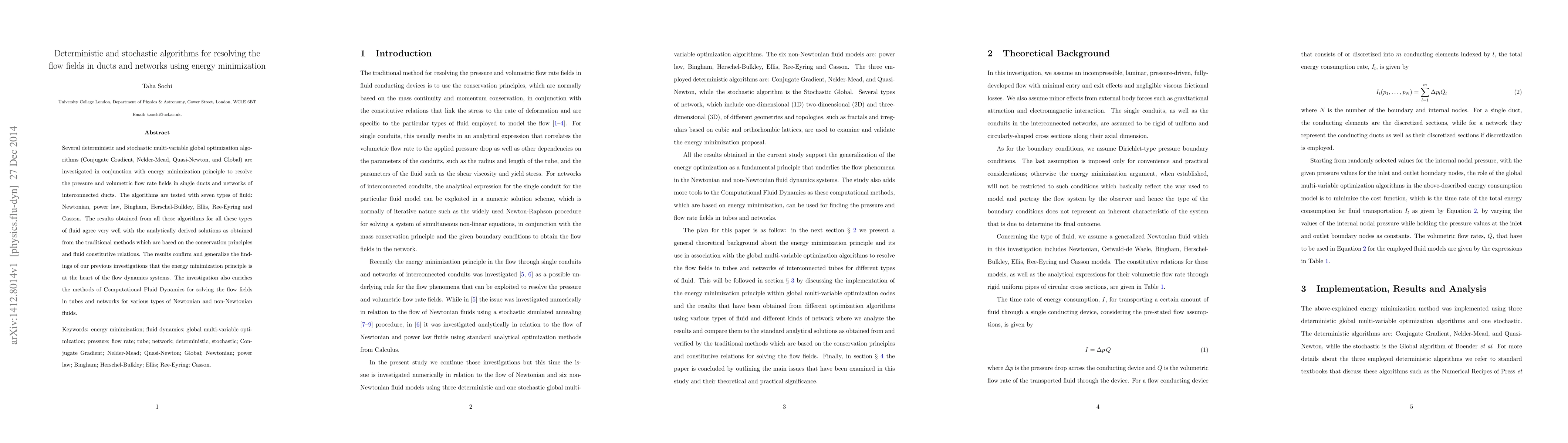 This paper investigates deterministic and stochastic optimization algorithms for resolving flow fields in ducts and networks using energy minimization. The tested algorithms—Conjugate Gradient, Nelder-Mead, Quasi-Newton, and Global—show excellent agreement with analytically derived solutions for various fluid types, confirming the energy minimization principle's role in flow dynamics.