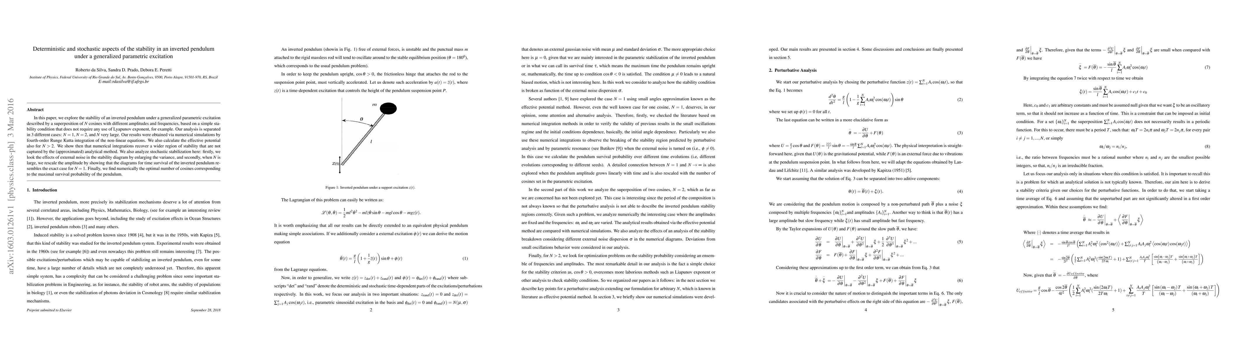 In this paper, we explore the stability of an inverted pendulum under a generalized parametric excitation described by a superposition of $N$ cosines with different amplitudes and frequencies, based on a simple stability condition that does not require any use of Lyapunov exponent, for example. Our analysis is separated in 3 different cases: $N=1$, $N=2$, and $N$ very large. Our results were obtained via numerical simulations by fourth-order Runge Kutta integration of the non-linear equations. We also calculate the effective potential also for $N>2$. We show then that numerical integrations recover a wider region of stability that are not captured by the (approximated) analytical method. We also analyze stochastic stabilization here: firstly, we look the effects of external noise in the stability diagram by enlarging the variance, and secondly, when $N$ is large, we rescale the amplitude by showing that the diagrams for time survival of the inverted pendulum resembles the exact case for $N=1$. Finally, we find numerically the optimal number of cosines corresponding to the maximal survival probability of the pendulum.