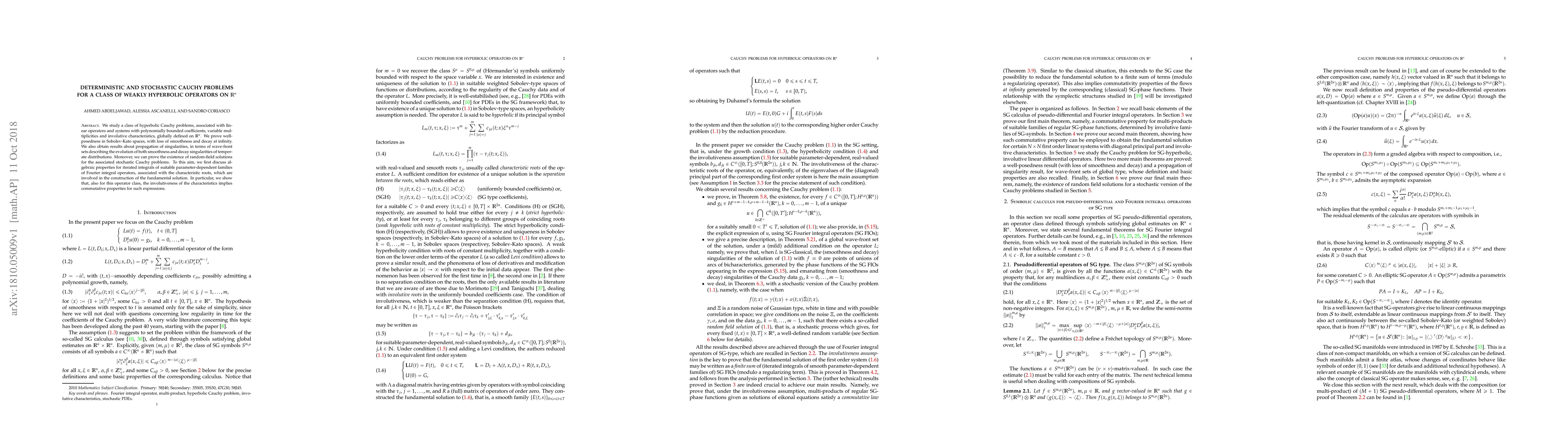 This paper investigates hyperbolic Cauchy problems linked to linear operators with polynomially bounded coefficients, proving well-posedness in Sobolev-Kato spaces and analyzing singularity propagation via wave-front sets. It also establishes the existence of random-field solutions for the corresponding stochastic Cauchy problems, leveraging algebraic properties of Fourier integral operators.