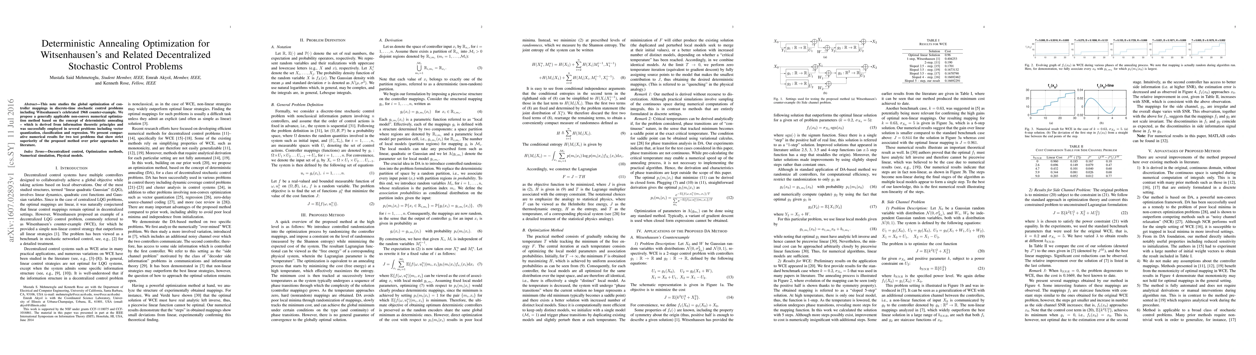 This paper proposes a non-convex optimization method based on deterministic annealing to solve global optimization problems in discrete-time stochastic control, including Witsenhausen's 1968 counter-example. Comparative results show the method's superiority over existing approaches.