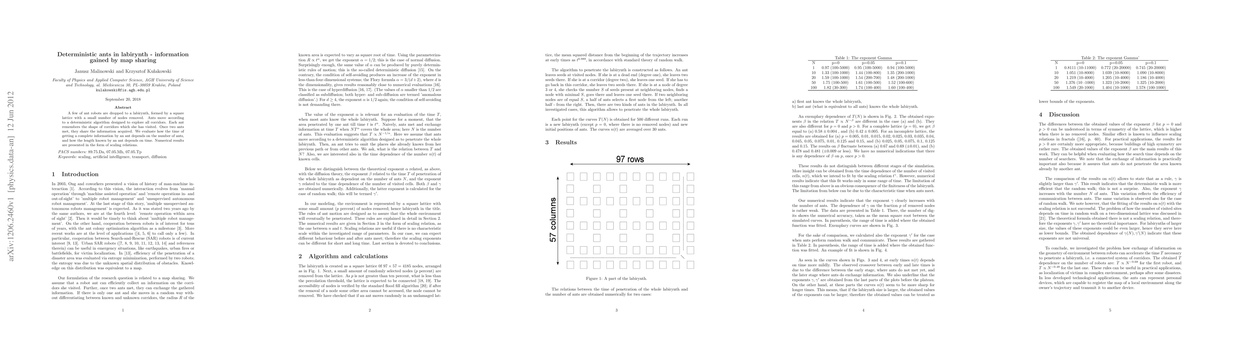 A few of ant robots are dropped to a labirynth, formed by a square lattice with a small number of nodes removed. Ants move according to a deterministic algorithm designed to explore all corridors. Each ant remembers the shape of corridors which she has visited. Once two ants met, they share the information acquired. We evaluate how the time of getting a complete information by an ant depends on the number of ants, and how the length known by an ant depends on time. Numerical results are presented in the form of scaling relations.