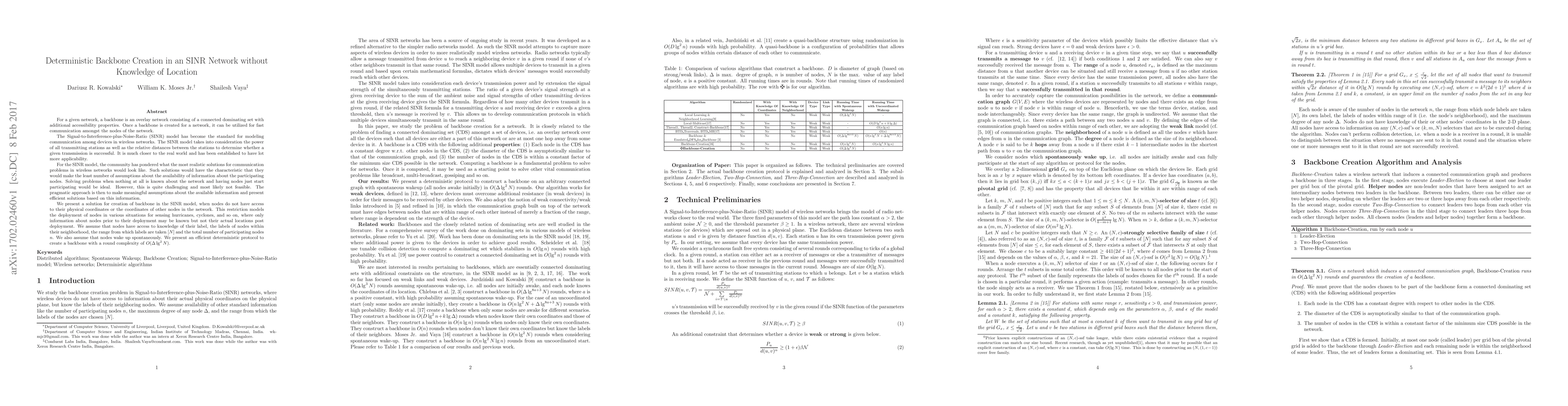For a given network, a backbone is an overlay network consisting of a connected dominating set with additional accessibility properties. Once a backbone is created for a network, it can be utilized for fast communication amongst the nodes of the network. The Signal-to-Interference-plus-Noise-Ratio (SINR) model has become the standard for modeling communication among devices in wireless networks. For this model, the community has pondered what the most realistic solutions for communication problems in wireless networks would look like. Such solutions would have the characteristic that they would make the least number of assumptions about the availability of information about the participating nodes. Solving problems when nothing at all is known about the network and having nodes just start participating would be ideal. However, this is quite challenging and most likely not feasible. The pragmatic approach is then to make meaningful assumptions about the available information and present efficient solutions based on this information. We present a solution for creation of backbone in the SINR model, when nodes do not have access to their physical coordinates or the coordinates of other nodes in the network. This restriction models the deployment of nodes in various situations for sensing hurricanes, cyclones, and so on, where only information about nodes prior to their deployment may be known but not their actual locations post deployment. We assume that nodes have access to knowledge of their label, the labels of nodes within their neighborhood, the range from which labels are taken $[N]$ and the total number of participating nodes $n$. We also assume that nodes wake up spontaneously. We present an efficient deterministic protocol to create a backbone with a round complexity of $O(\Delta \lg^2 N)$.
