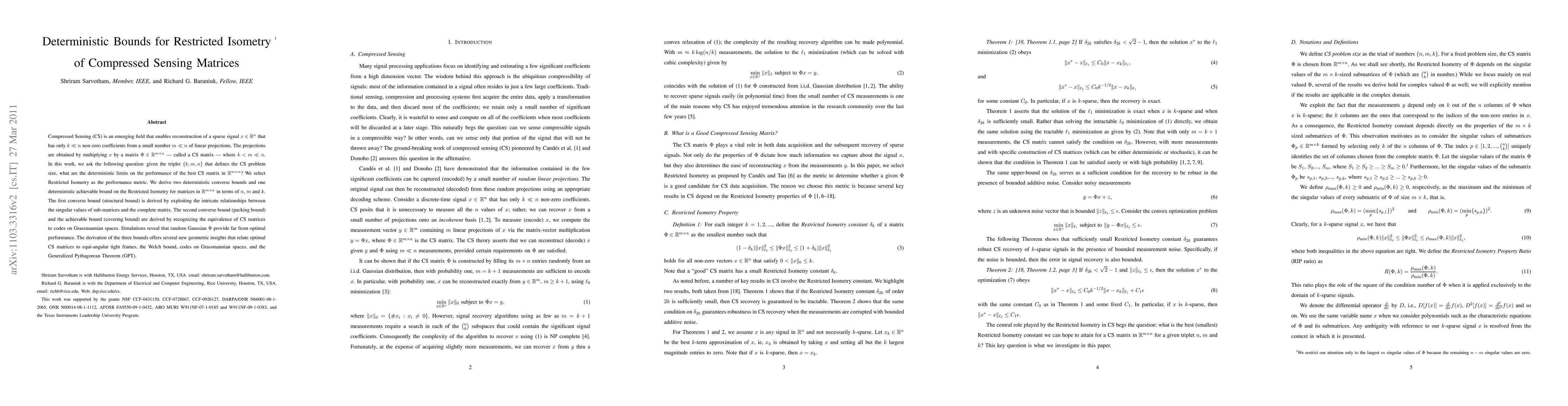 Compressed Sensing (CS) is an emerging field that enables reconstruction of a sparse signal $x \in {\mathbb R} ^n$ that has only $k \ll n$ non-zero coefficients from a small number $m \ll n$ of linear projections. The projections are obtained by multiplying $x$ by a matrix $\Phi \in {\mathbb R}^{m \times n}$ --- called a CS matrix --- where $k < m \ll n$. In this work, we ask the following question: given the triplet $\{k, m, n \}$ that defines the CS problem size, what are the deterministic limits on the performance of the best CS matrix in ${\mathbb R}^{m \times n}$? We select Restricted Isometry as the performance metric. We derive two deterministic converse bounds and one deterministic achievable bound on the Restricted Isometry for matrices in ${\mathbb R}^{m \times n}$ in terms of $n$, $m$ and $k$. The first converse bound (structural bound) is derived by exploiting the intricate relationships between the singular values of sub-matrices and the complete matrix. The second converse bound (packing bound) and the achievable bound (covering bound) are derived by recognizing the equivalence of CS matrices to codes on Grassmannian spaces. Simulations reveal that random Gaussian $\Phi$ provide far from optimal performance. The derivation of the three bounds offers several new geometric insights that relate optimal CS matrices to equi-angular tight frames, the Welch bound, codes on Grassmannian spaces, and the Generalized Pythagorean Theorem (GPT).