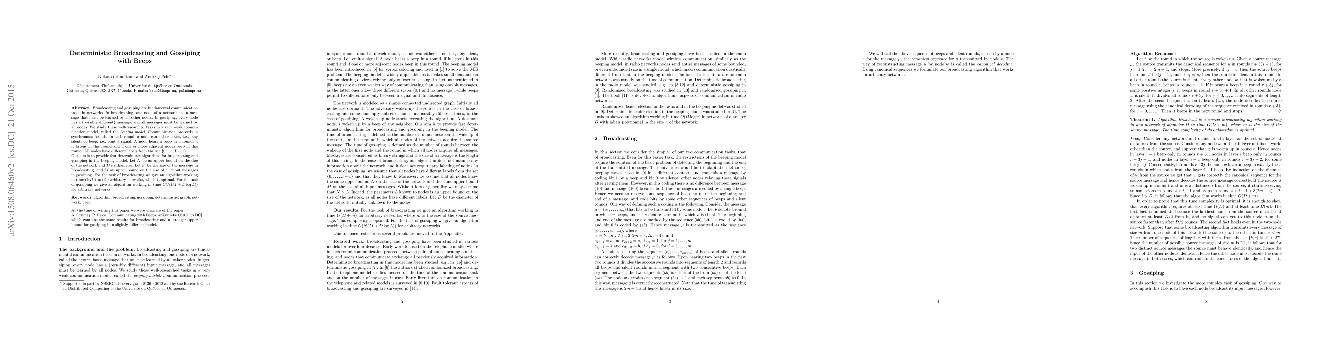 This paper presents deterministic algorithms for broadcasting and gossiping in the "beeping model," where nodes communicate by emitting signals. It provides an optimal $O(D+m)$ time algorithm for broadcasting and an $O(N(M+D\log L))$ time algorithm for gossiping, where $D$ is the network diameter, $N$ is the network size, $m$ is the message size, and $M$ is the total size of all messages.