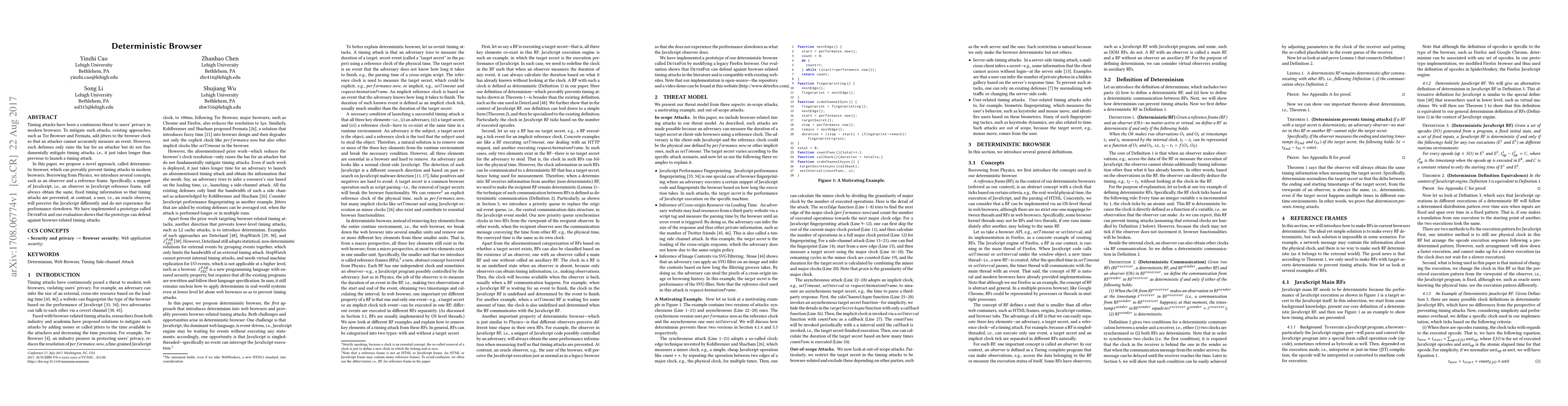 Timing attacks have been a continuous threat to users' privacy in modern browsers. To mitigate such attacks, existing approaches, such as Tor Browser and Fermata, add jitters to the browser clock so that an attacker cannot accurately measure an event. However, such defenses only raise the bar for an attacker but do not fundamentally mitigate timing attacks, i.e., it just takes longer than previous to launch a timing attack. In this paper, we propose a novel approach, called deterministic browser, which can provably prevent timing attacks in modern browsers. Borrowing from Physics, we introduce several concepts, such as an observer and a reference frame. Specifically, a snippet of JavaScript, i.e., an observer in JavaScript reference frame, will always obtain the same, fixed timing information so that timing attacks are prevented; at contrast, a user, i.e., an oracle observer, will perceive the JavaScript differently and do not experience the performance slowdown. We have implemented a prototype called DeterFox and our evaluation shows that the prototype can defend against browser-related timing attacks.