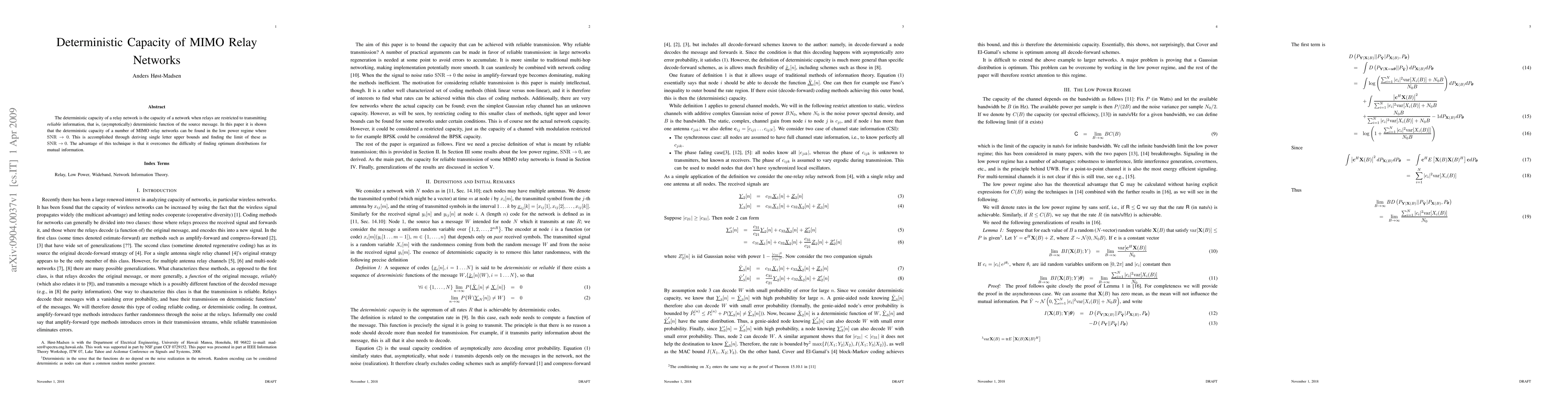 This paper explores the deterministic capacity of MIMO relay networks under low power conditions, demonstrating that it can be determined by deriving single letter upper bounds and examining their limits as signal-to-noise ratio approaches zero, thus circumventing the challenge of finding optimal mutual information distributions.