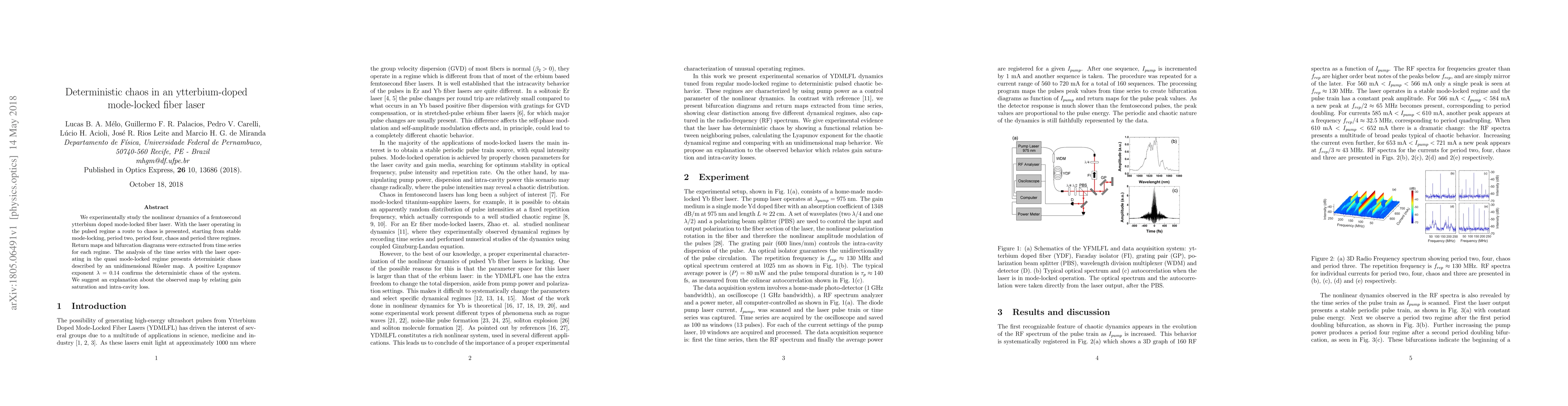 We experimentally study the nonlinear dynamics of a femtosecond ytterbium doped mode-locked fiber laser. With the laser operating in the pulsed regime a route to chaos is presented, starting from stable mode-locking, period two, period four, chaos and period three regimes. Return maps and bifurcation diagrams were extracted from time series for each regime. The analysis of the time series with the laser operating in the quasi mode-locked regime presents deterministic chaos described by an unidimensional Rossler map. A positive Lyapunov exponent $\lambda = 0.14$ confirms the deterministic chaos of the system. We suggest an explanation about the observed map by relating gain saturation and intra-cavity loss.