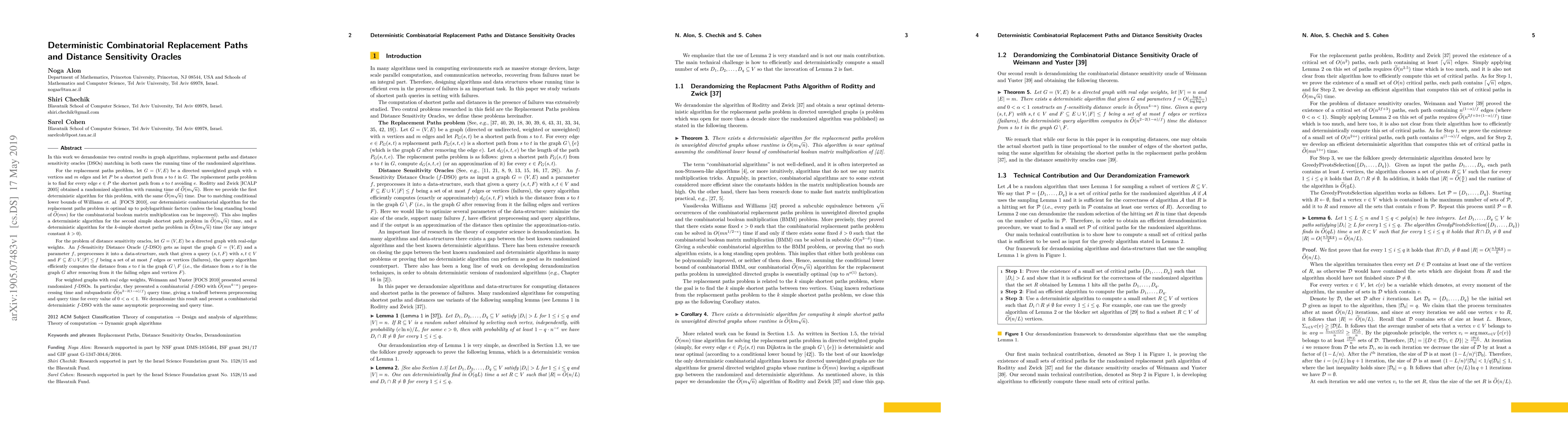 This paper presents deterministic algorithms for two central graph problems: replacement paths and distance sensitivity oracles. It achieves the same running time as the best randomized algorithms, providing a deterministic solution for finding shortest paths avoiding specific edges and for constructing distance sensitivity oracles for weighted graphs.