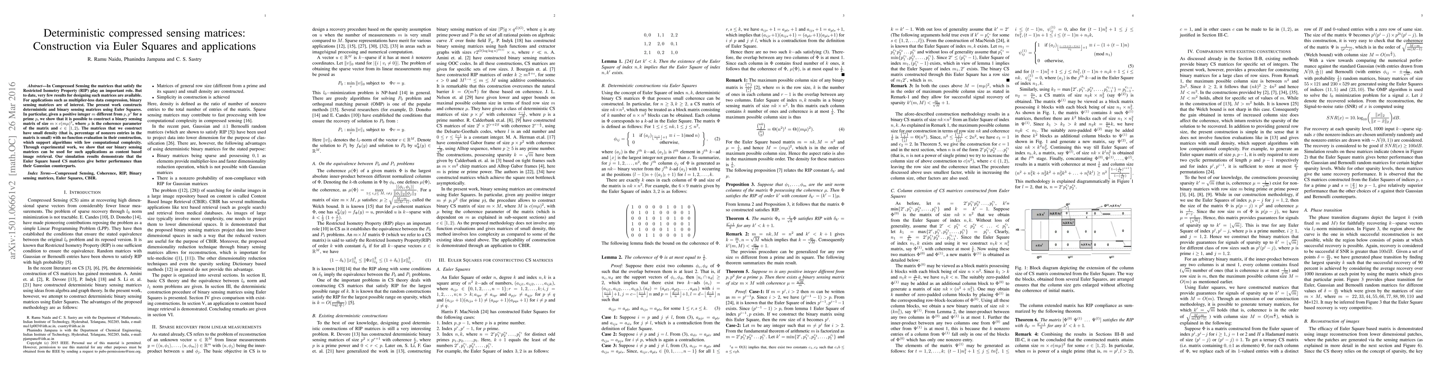 This paper constructs deterministic and binary compressed sensing matrices using Euler Squares, demonstrating their effectiveness for applications like multiplier-less data compression. The proposed matrices have low density and computational complexity, and outperform Gaussian matrices in content-based image retrieval.