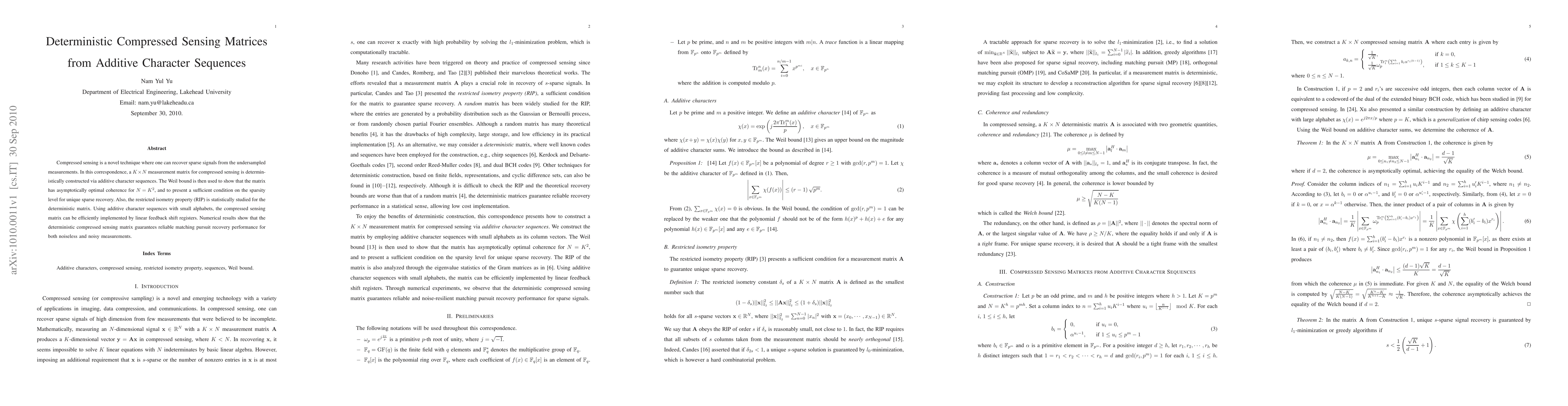 This paper constructs a deterministic compressed sensing matrix using additive character sequences, demonstrating optimal coherence and unique sparse recovery under the Weil bound. The matrix's restricted isometry property is statistically analyzed, and it is efficiently implemented using linear feedback shift registers, showing reliable recovery performance in both noiseless and noisy scenarios.