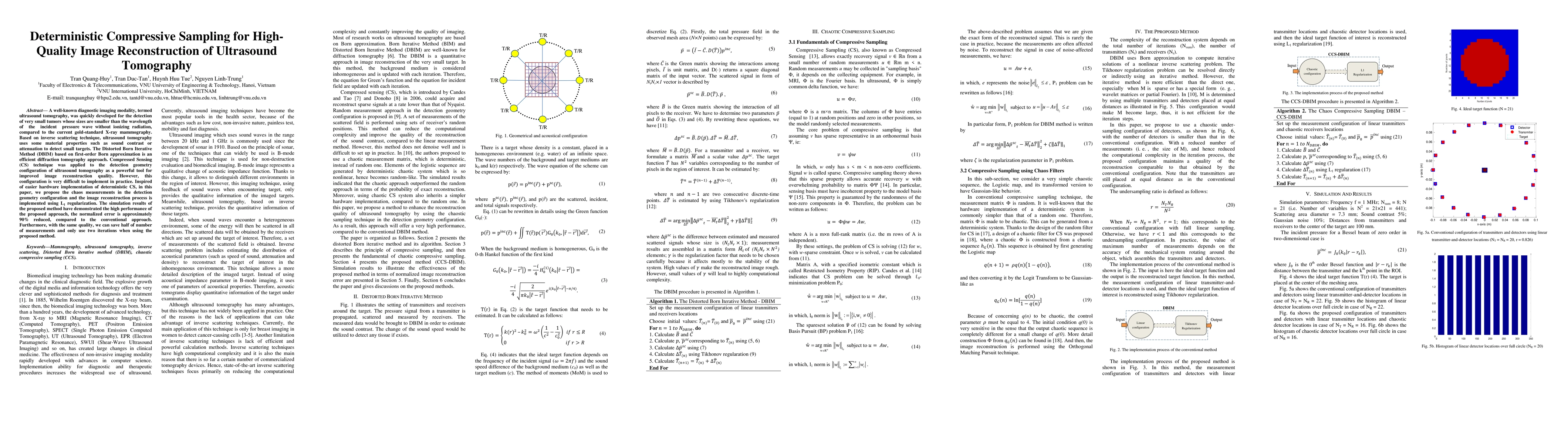 This paper proposes a deterministic compressive sampling method for high-quality image reconstruction in ultrasound tomography, utilizing chaos measurements and L1 regularization. Simulation results show a 90% reduction in normalized error and significant reduction in measurement count and iterations compared to conventional methods.