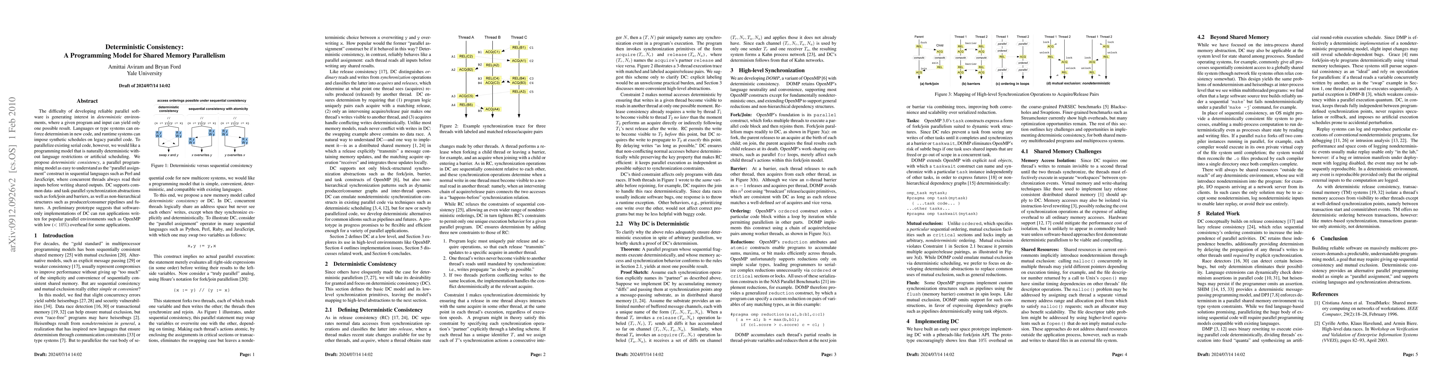 A new parallel programming model called deterministic consistency is proposed to enable reliable parallel software without language restrictions or artificial scheduling. Preliminary results suggest low overhead (<10%) for implementing DC in popular parallel environments like OpenMP.