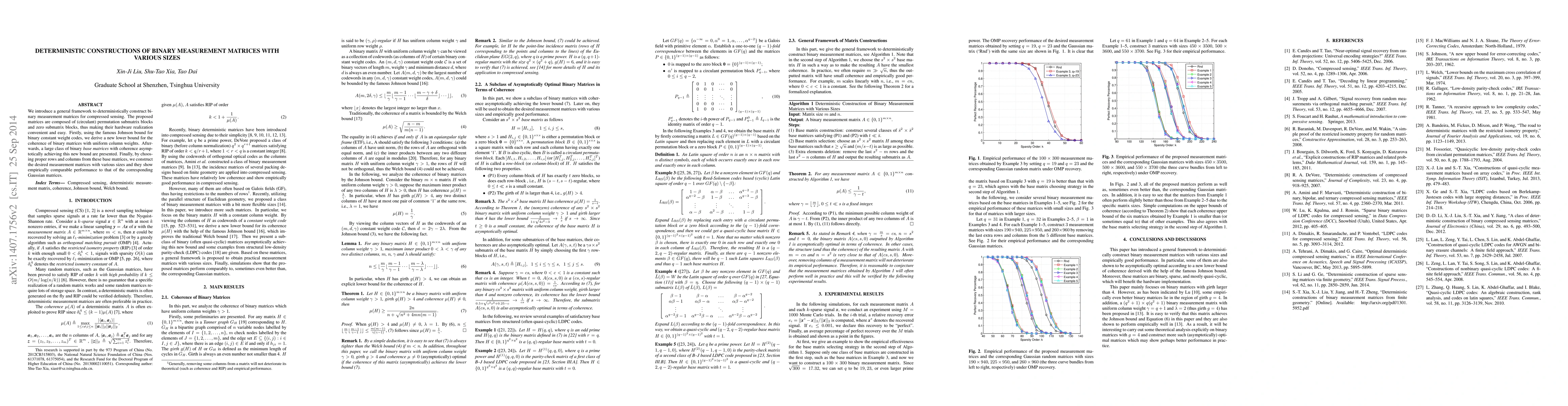 This paper presents a deterministic method for constructing binary measurement matrices for compressed sensing, utilizing circulant permutation and zero submatrix blocks for easy hardware implementation. The authors derive a new lower bound for coherence and demonstrate a class of matrices achieving this bound, ultimately constructing matrices of various sizes with performance comparable to Gaussian matrices.